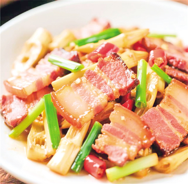 烟熏好的腊肉不仅色泽诱人,香气扑鼻,更是承载着漩涡人民对传统美食的坚守与传承。每当春风拂过,腊肉与竹笋的香气交织在一起,便构成了漩涡镇独有的山野诱惑。每一块腊肉肥瘦相间得恰到好处,肥的部分晶莹剔透,入口即化;瘦的部分嚼劲十足,唇齿留香,那是一种岁月沉淀下来的独特风味,让人回味无穷。