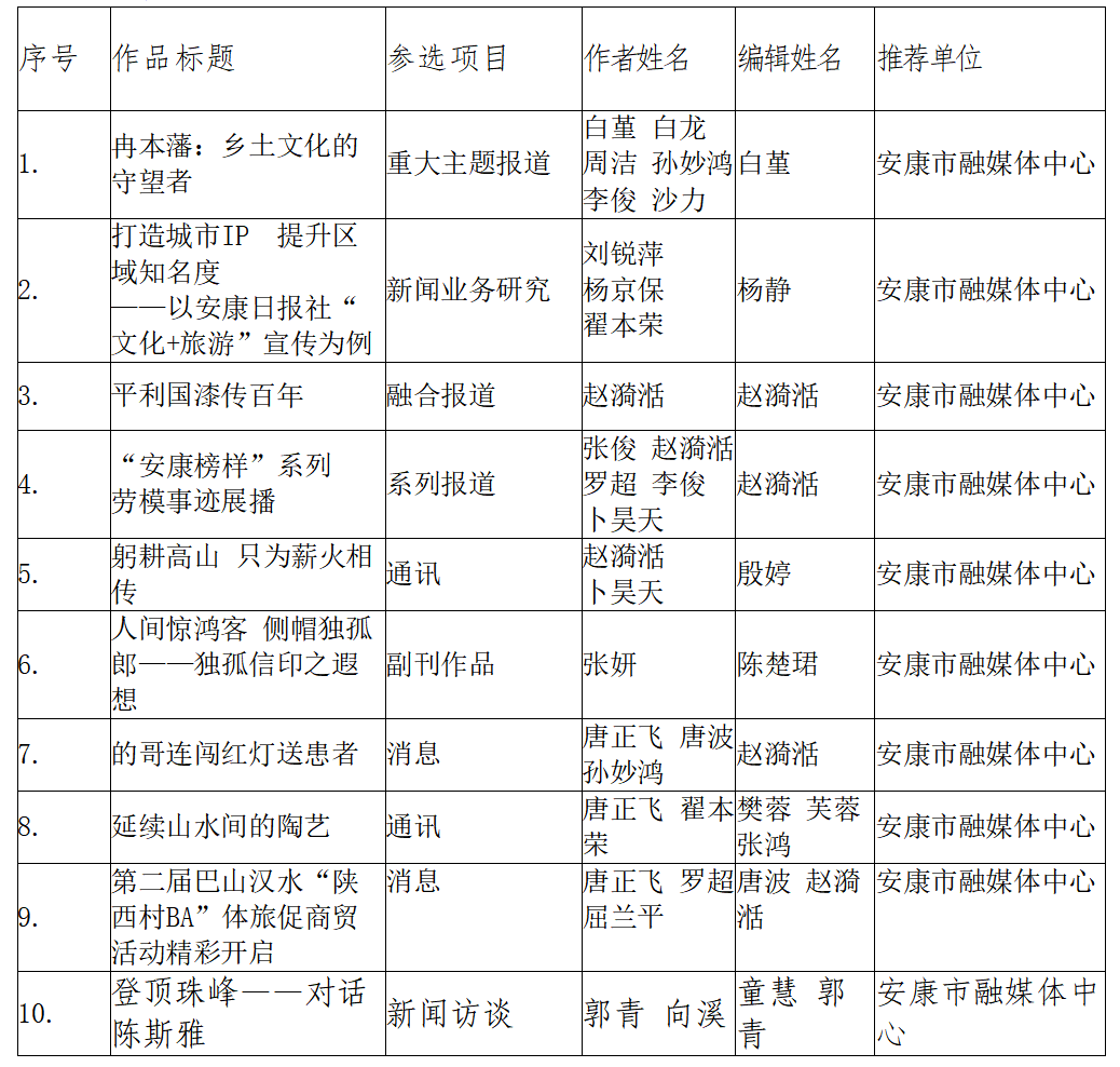 附件:安康优秀新闻作品报送目录(补充)(共计10件)