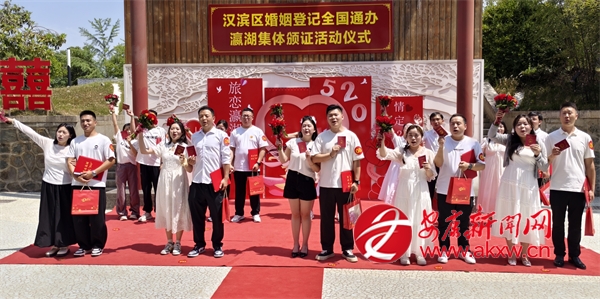 在做好窗口登记的同时,汉滨区婚姻登记服务中心拓展服务形式,在瀛湖金螺岛户外颁证基地,开展“5·20新‘证’启航,幸福‘通办’未来”集体颁证活动,邀请10对新人开展集体户外颁证,在众人的见证下宣读爱情誓言,接受大家的祝福。