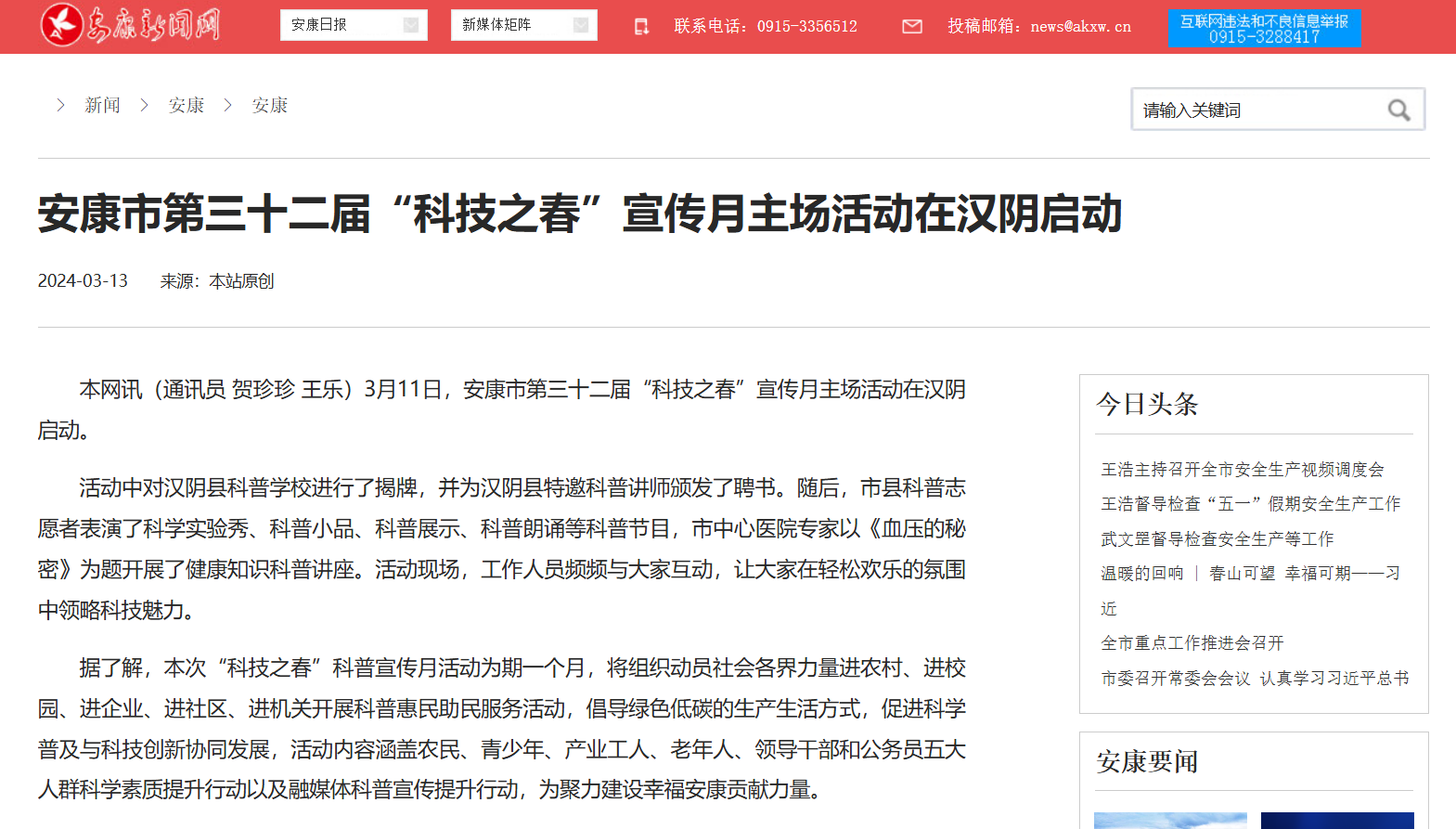 《安康市第三十二届“科技之春”宣传月主场活动在汉阴启动》(2024-03-13发布)