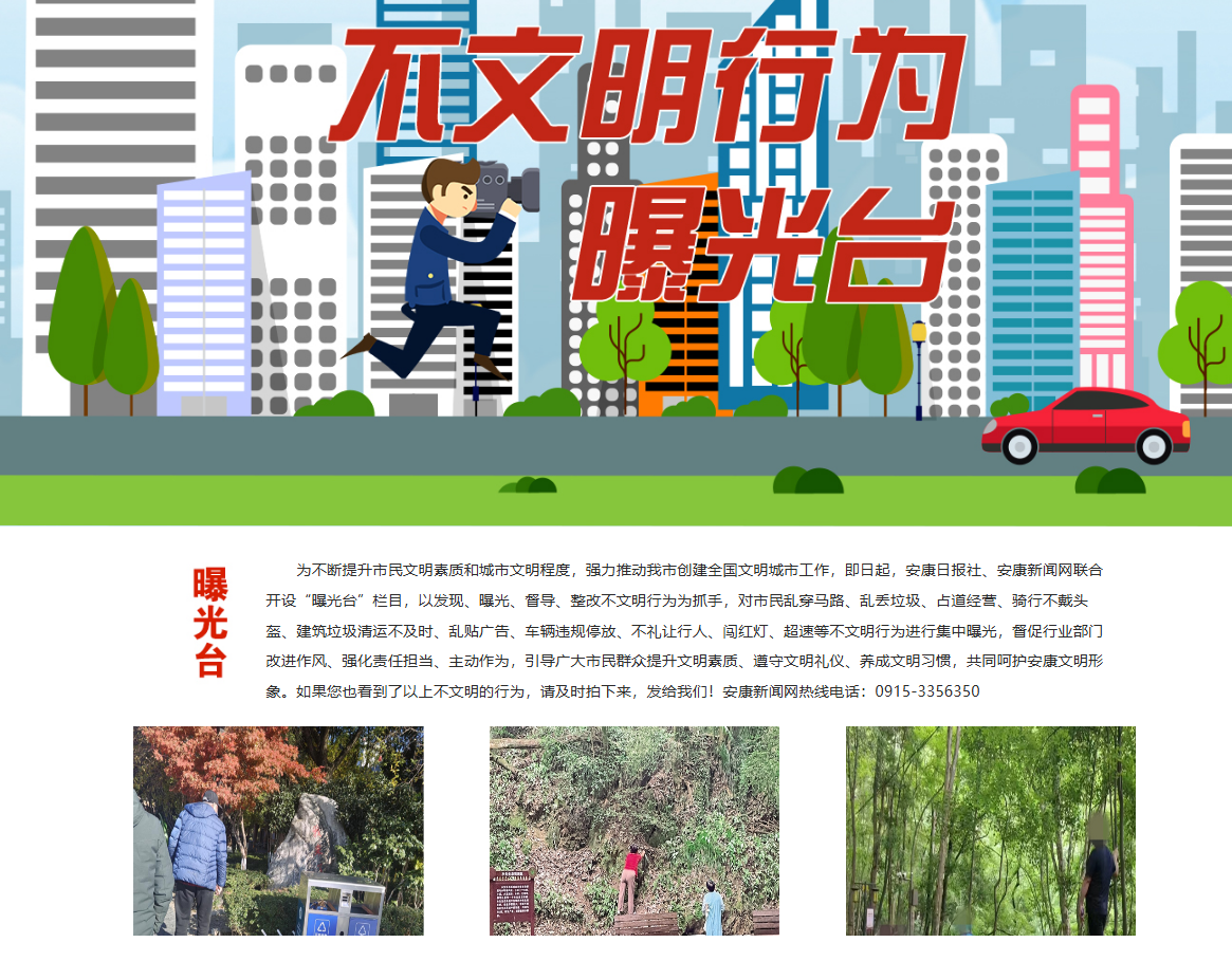 安康新闻网继续充分发挥舆情监测和舆论监督作用,以高度负责的态度,及时监测上报重大舆情信息。开设《不文明行为曝光台》舆论监督专栏,集中曝光身边的不文明现象、行为,发布消息报道19篇,引导市民群众自觉规范文明行为,主动融入城市文明创建热潮,为提升市民文明素质和城市文明程度贡献媒体力量,体现地方党媒的责任与担当。