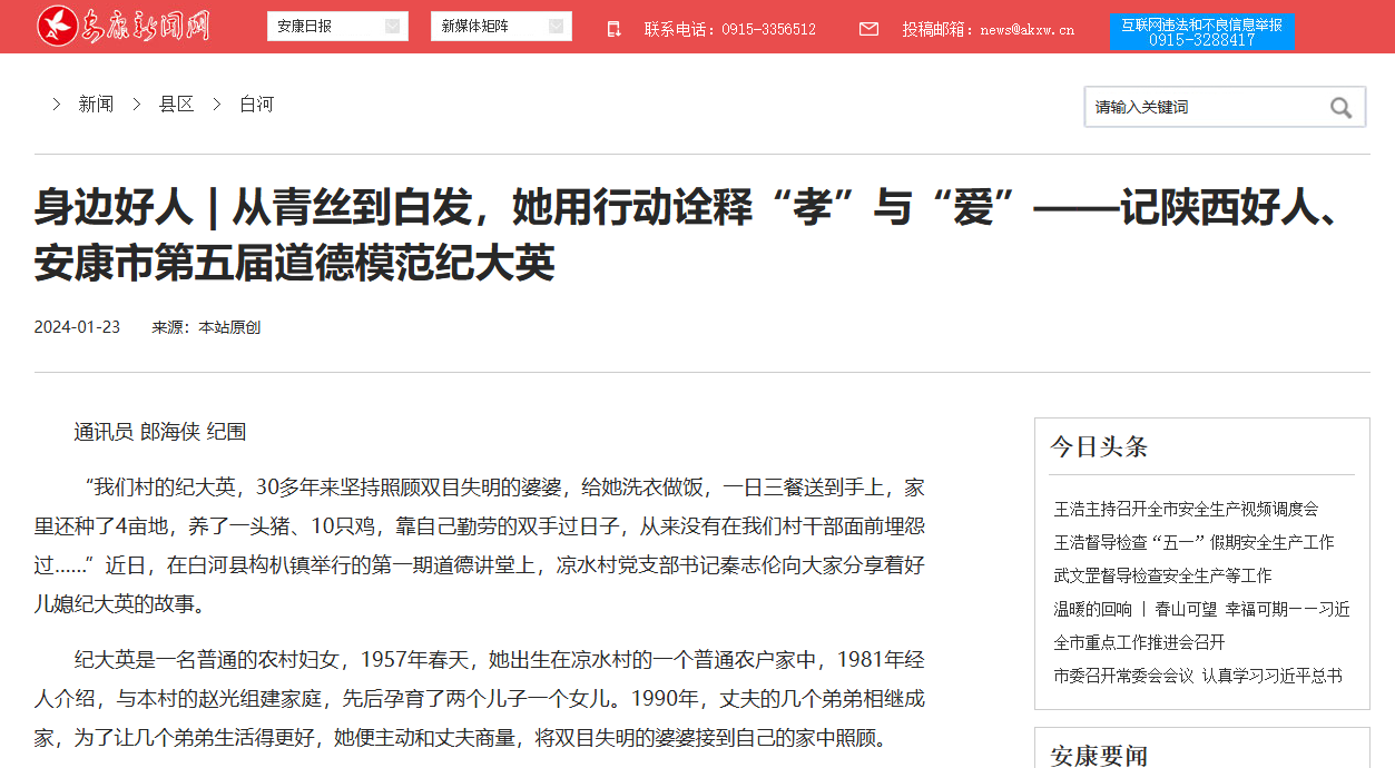 《身边好人 | 从青丝到白发,她用行动诠释“孝”与“爱”——记陕西好人、安康市第五届道德模范纪大英》(2024-01-23发布)