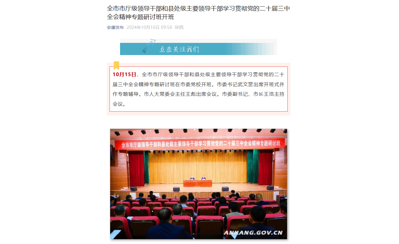 《全市市厅级领导干部和县处级主要领导干部学习贯彻党的二十届三中全会精神专题研讨班开班》(2024-10-16发布于安康发布公众号)