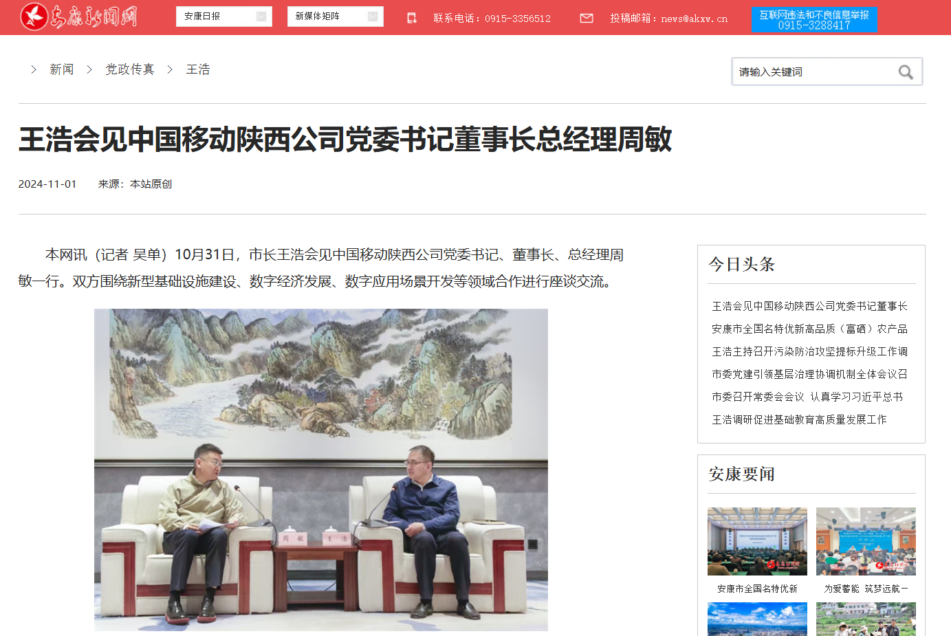 《王浩会见中国移动陕西公司党委书记董事长总经理周敏》(2024-11-01发布)