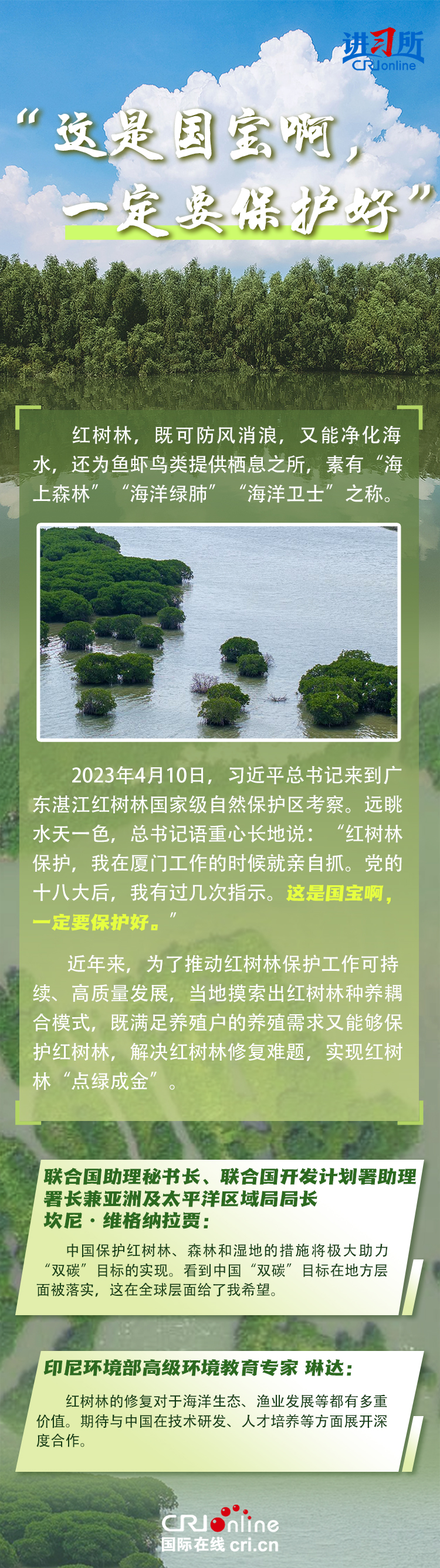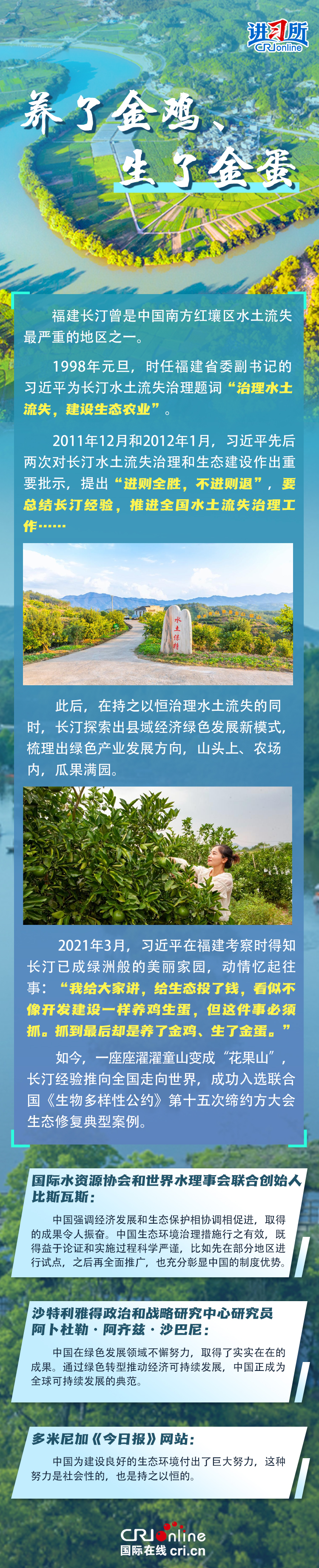 新时代以来,在习近平生态文明思想的科学指引下,“两山”理念已深入人心,从“点绿成金”的红树林到一座座“花果山”,再到走向世界的长汀经验……美丽中国建设迈出重大步伐,生态环境保护发生历史性变化。国际社会认为,中国取得广泛的绿色发展成就,从根本上源于习近平生态文明思想,特别是“两山”理念的指引。在通过绿色转型推动经济可持续发展方面,中国正成为全球可持续发展的典范。