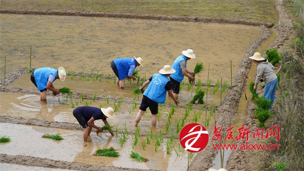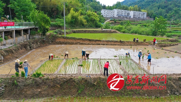 6月5日,走进城关镇渔湾村麻庄组,一片热火朝天的农忙景象映入眼帘。农技人员与农户们并肩作战,共同进行水稻插秧作业。划线分区、精准配肥、均匀撒肥、有序插秧……每一项工作都进行得有条不紊,大家分工明确、配合默契,田间地头处处洋溢着忙碌而欢快的气息。