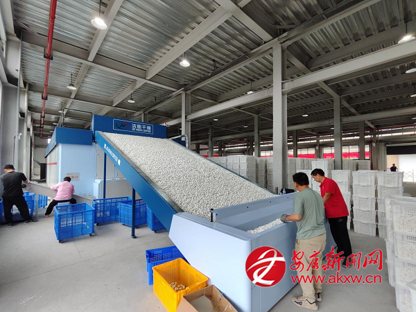 6月7日,石泉县经开区池河园区蚕茧交易智能化收烘中心厂房里,工作人员正在紧张有序地忙碌着,将一框框鲜茧倒入传送带上进行烘干。据了解,该智能化收烘中心是集鲜茧交易、存储及烘炕为一体的综合服务场所,是石泉县池河镇2025年重点招商引资项目,该项目的建成投产有效解决蚕茧收购和烘干不及时的问题。该收烘中心年鲜茧交易金额约2000万元,日处理能力为20吨,可提供工作岗位30个,带动群众就业增收。(通讯员 王朋)