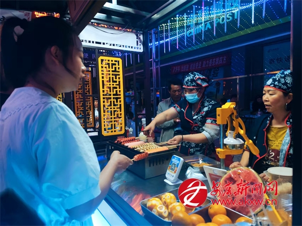 6月15日晚上,夜色渐深。宁陕县滨河公园的小吃街变得热闹非凡。30家摊位整齐有序地排列开来,洋芋糍粑软糯香甜,玉米锅巴酥脆可口,麻辣豆腐干鲜香四溢,特色美食的香气在空气中弥漫开来,市民们络绎不绝、穿梭其间。
