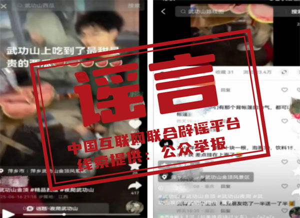 真相:近日,有网民在短视频平台发布“江西萍乡武功山景区存在‘一锤子买卖’‘天价西瓜’”的视频,引发社会关注。经查,视频中 “卖西瓜” 的男子实为旅行社组织的武功山景区游客,途中接受视频发布者邀请参与拍摄了一段“卖西瓜”的视频。该西瓜系旅行社同行人员所带,并非如视频所说在景区内购买,景区也不存在网传的“18元泡面”、“240元西瓜”等情况。目前,公安机关已对造谣者作出行政拘留十日的行政处罚。(来源:“公安部网安局”微信公众号、“江西网警”微信公众号)