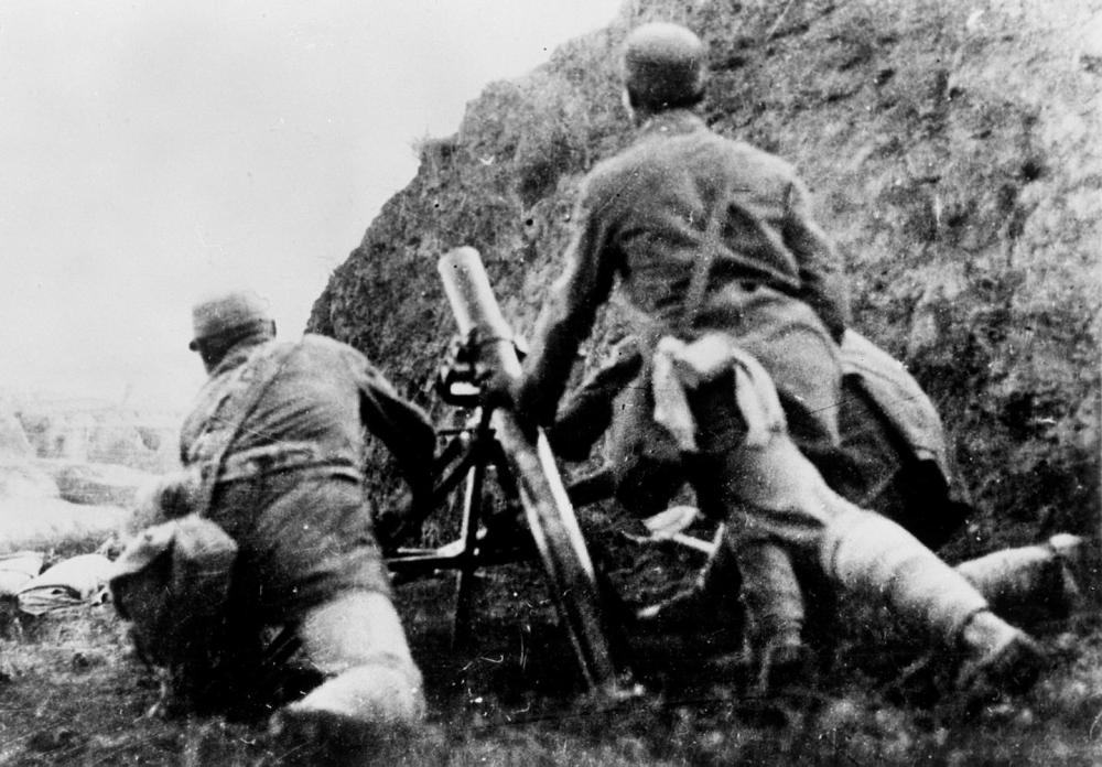 资料照片:1940年秋,八路军在华北地区先后集中了100多个团,对日本侵略军进行战略性进攻和反“扫荡”作战,沉重地打击了入侵之敌,打响了著名的“百团大战”。图为我军炮击敌碉堡。 新华社发