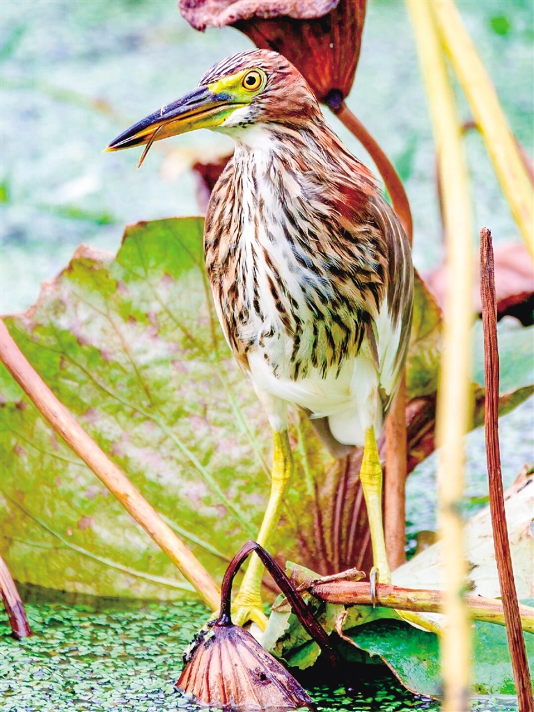 繁殖期头及颈深栗色,胸酱紫色;非繁殖期背部褐色,头、颈、上胸部具褐色纵纹,下腹部及翼为白色;嘴基黄而尖端黑色,跗趾黄色。非繁殖期飞行时因白色的腹部和飞羽,易与白鹭混淆,背部有深色阴影是其分辨特征。(来源:安康市林学会)