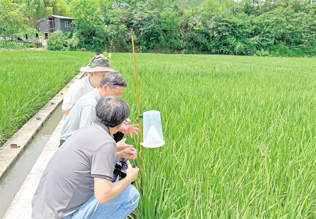 日头渐渐升高,稻田里的露水被晒成水汽,连片的稻禾舒展着叶片,阳光下泛着健康的碧绿色。黄林权沿着田垄往前走,每经过一个诱捕器就停下来,或调整角度,或记录数量,鞋上的泥点溅到裤腿上也浑然不觉。