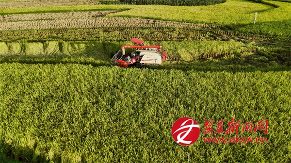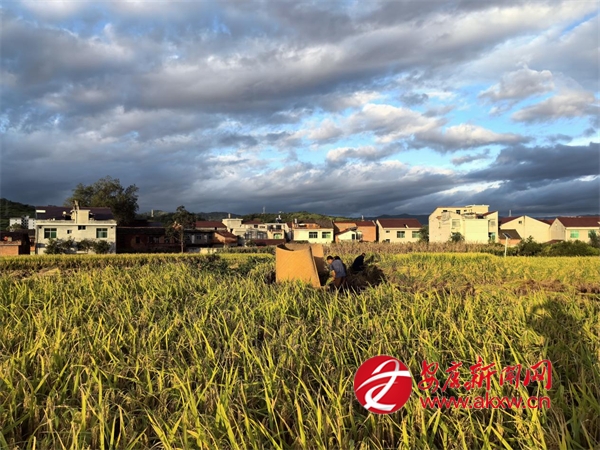 走进新河村,阳光洒在沉甸甸的稻穗上,饱满的谷粒泛着金黄光泽。微风拂过,连片稻田掀起层层稻浪,裹挟着清新的谷物香气弥漫田间。稻田里,农机手熟练地操控着收割机,在田间来回穿梭,机身所过之处,水稻快速完成脱粒、秸秆分离,金黄的稻谷源源不断送入机仓,实现颗粒归仓;为进一步加快水稻收割进度,几位村民则支起拌桶,手持稻把用力拍打,沿用传统打谷技艺同步抢收,机器轰鸣声、打谷声与村民的欢声笑语交织成秋日丰收的“协奏曲”。