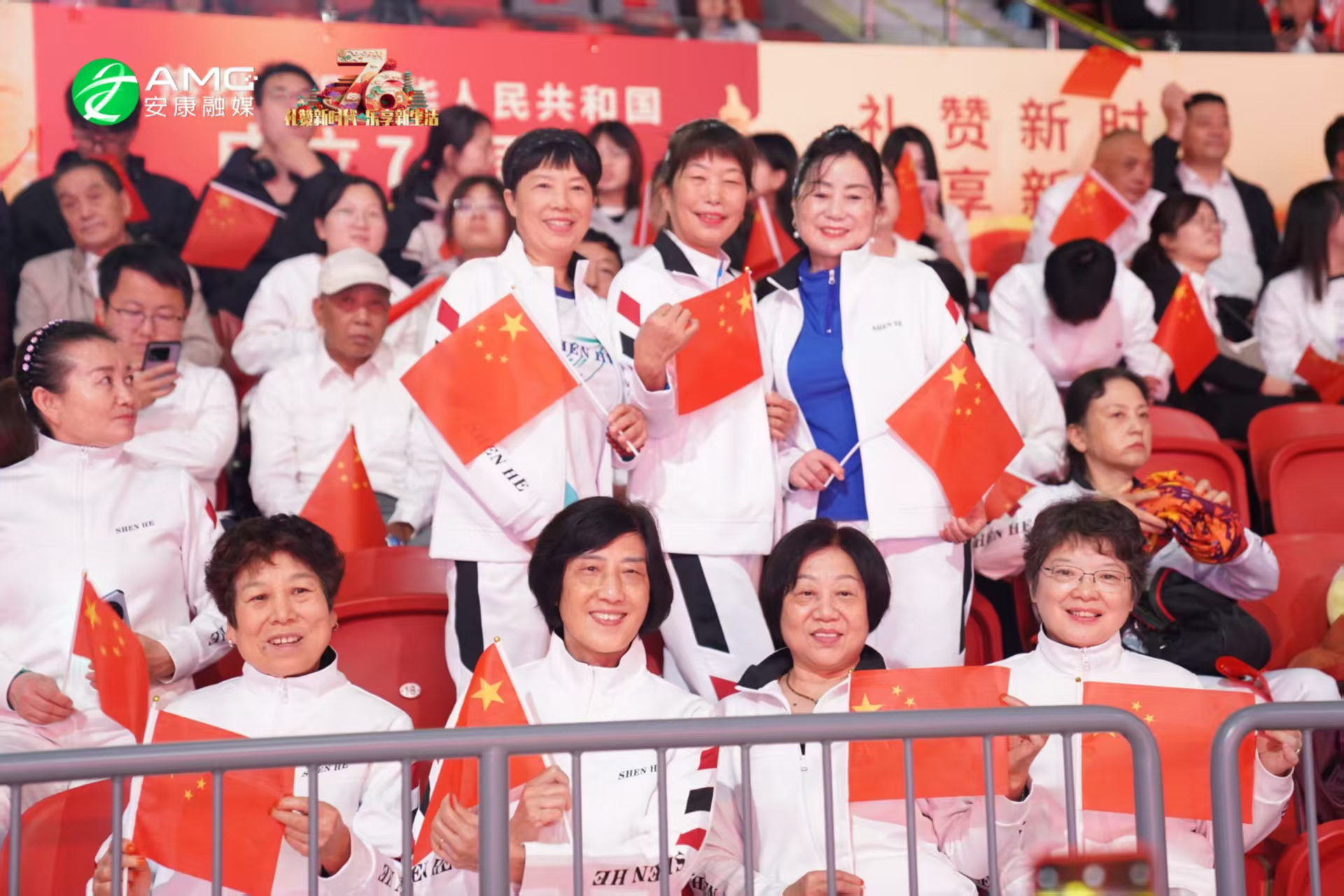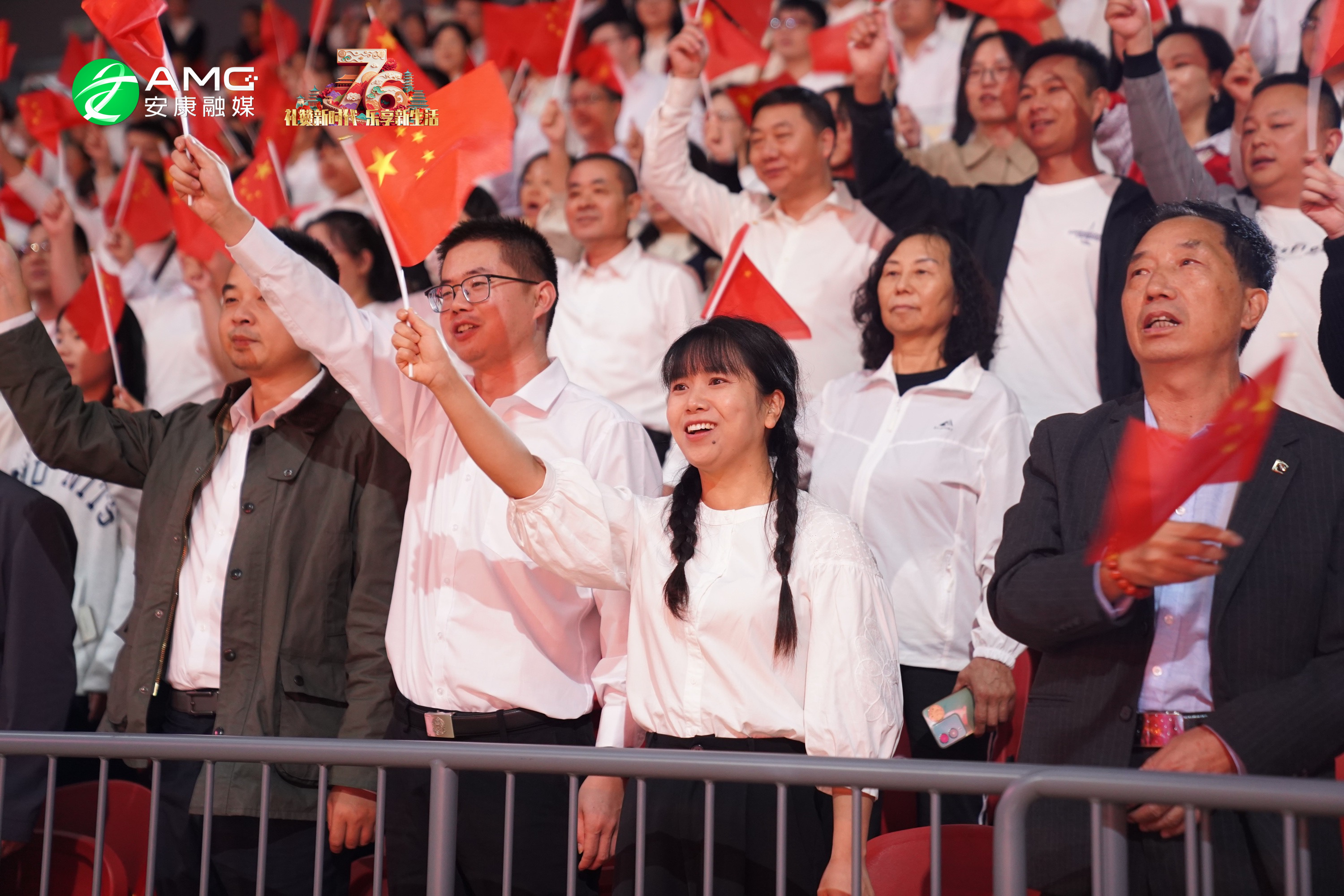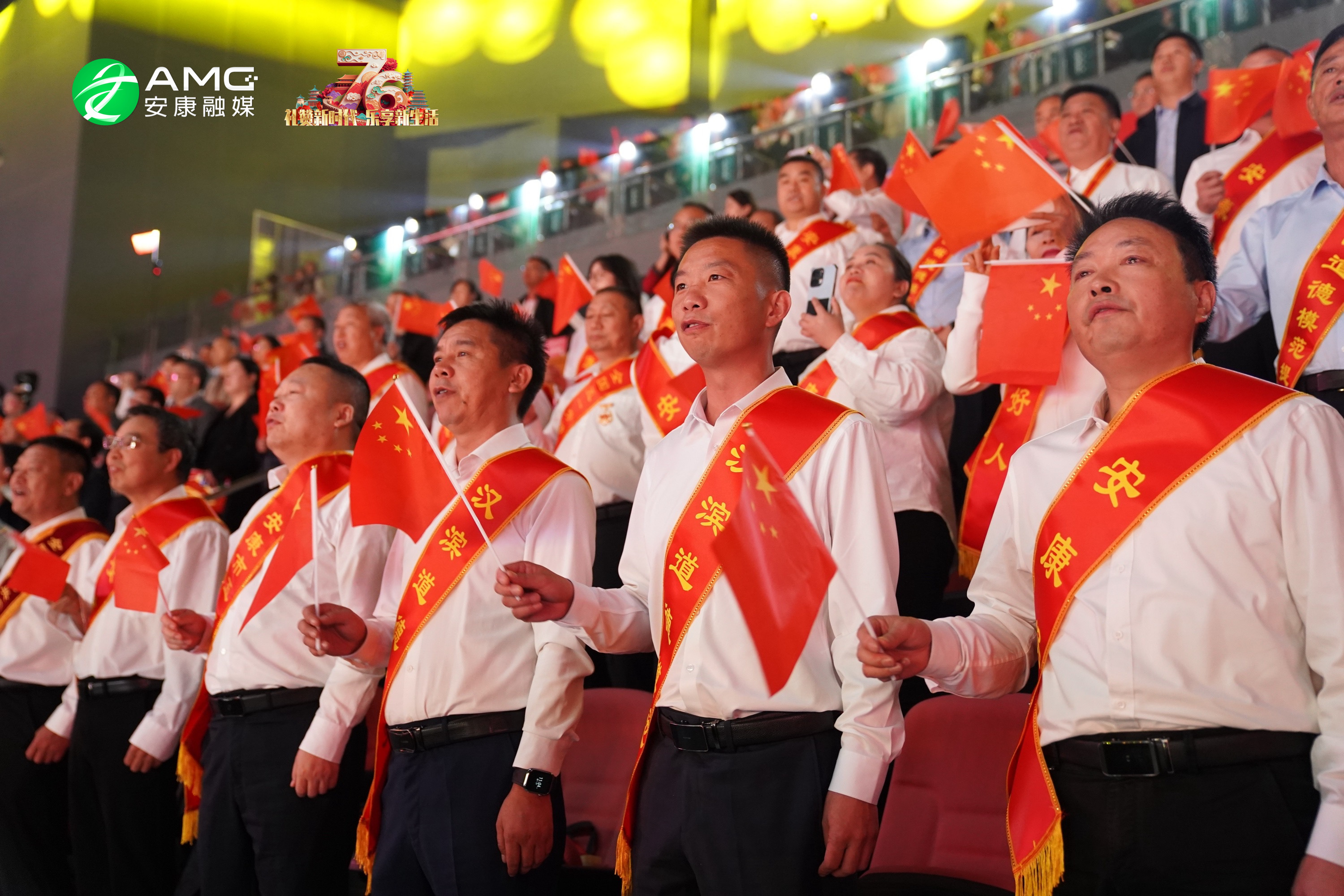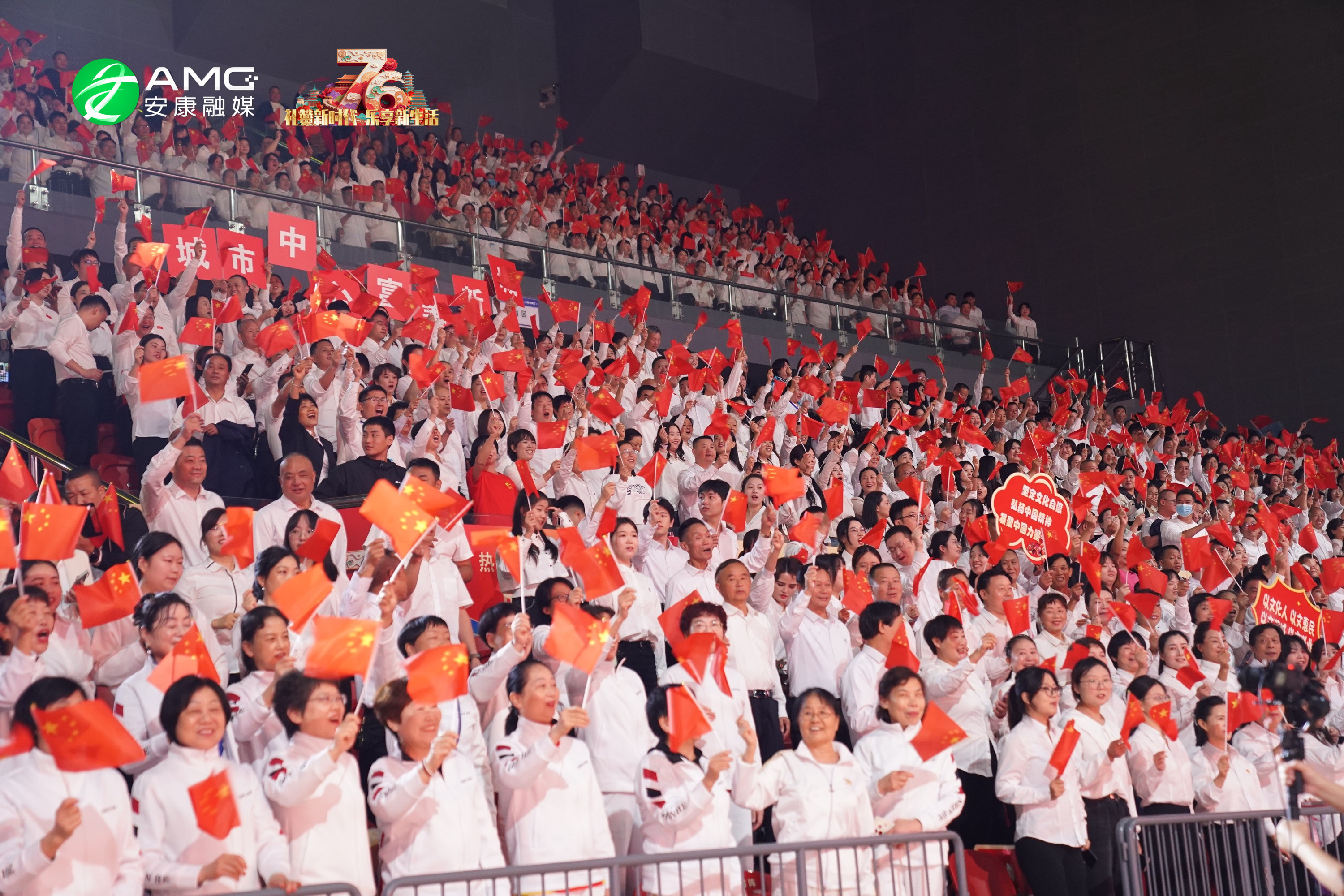 最后,全场人员起立挥舞红旗,齐声高唱《歌唱祖国》,用最真挚的歌声祝福祖国繁荣昌盛,祝愿安康的明天更加美好。歌声震彻场馆,将整场活动推向高潮。