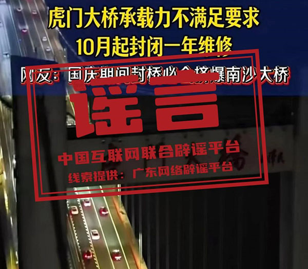真相:近日,网络上流传“虎门大桥10月起封闭维修”的消息。经东莞日报记者核实,该信息不准确。虎门大桥在国庆假期期间将正常通行且继续实行免费政策。9月29日,广东虎门大桥有限公司明确表示:虎门大桥在2026年春节前不会采取全封或半封措施,具体封闭时间及方案,目前均未确定。据悉,此前东莞市发展和改革局曾发布过相关评估前的公示,其中提到预计开工时间,但并非实际施工时间。(来源:“广东省互联网举报中心”微信公众号、东莞日报)
