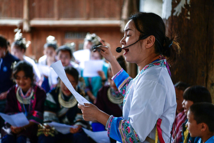 随着国产动画电影《哪吒之魔童闹海》不断刷新中国影史票房纪录,参与电影配乐的贵州省榕江县三宝侗寨的杨想妮和“舞乐蝉歌”团队为更多人所熟知。乐团成员怀揣“用音乐传递侗族文化,让世界听见侗族大歌”的共同梦想,将侗族大歌推向更广阔的舞台。这是2025年4月22日,杨想妮在贵州省黎平县肇兴镇厦格侗寨教前来研学的孩子们唱侗歌。