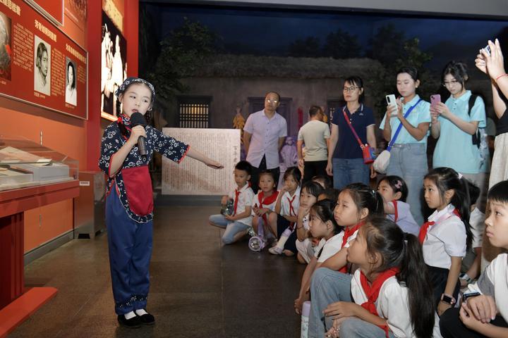 2025年8月7日,在山东省临沂市沂蒙革命纪念馆,沂蒙红孩子文艺先锋队的房沫昕在讲述红色故事《沂蒙红嫂祖秀莲》。2024年9月,位于沂蒙革命老区的山东省临沂市以“传承沂蒙精神”为宗旨组建沂蒙红孩子文艺先锋队,通过歌舞、朗诵、故事讲述、舞台剧等红色主题文艺节目,增强红色文化感染力,不断为红色基因代代相传注入新生力量。