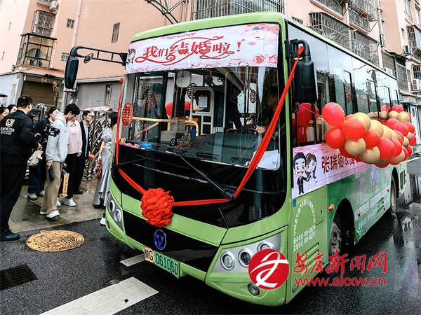 为了让公交车更有“婚礼氛围”,新郎、新娘和亲友们一起用气球、饰品和贴画对车厢进行了简单装饰,既温馨又不浮夸。10月4日迎亲当天,精心装饰的婚车准时到达目的地。横幅海报“我们结婚啦”与红绣球贴在公交车头,气球贴满车身,将接亲的仪式感“拉满”。新郎、新娘在众多亲朋好友的陪伴下,一起登上这辆“专车”,驶向名为“幸福”的下一站。车厢内,互动节目层出不穷,祝福歌声不断,一路欢声笑语。车窗外,不少市民看到这独特的“婚车”,纷纷拿出手机拍照,挥手送上祝福。