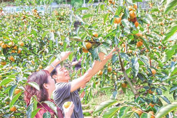 10月8日,游客在石泉县城关镇丝银坝村脆甜柿子果园体验采摘乐趣。许兵 摄