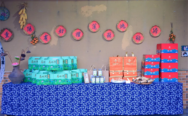 此外,活动现场精心打造了“重阳有好礼,莲藕炖猪蹄”网红墙,成为参会人员打卡留恋的热门地点;同时,设置了农副产品展销区,集中呈现紫阳蒸盆子、蒿坪河莲藕、紫阳荷叶茶、莲藕炖猪蹄等特色农副产品。值得关注的是,硒园农庄此次首次推出“蒿坪河莲藕炖猪蹄”伴手礼盒,分为“四至五人份”和“八至十人份”两种规格,于重阳节前夕上市。该礼盒将堂食菜品转化为便携商品,为当地莲藕销售拓展了新渠道,也为莲藕产业链延伸做了初步尝试。
