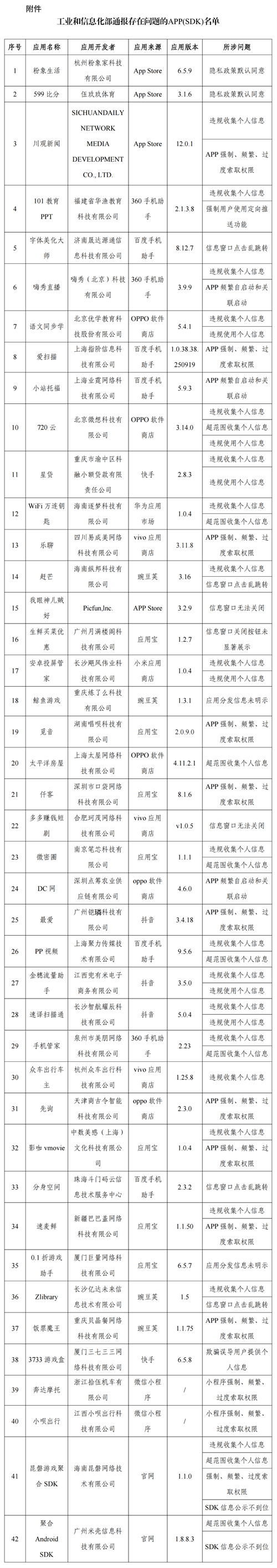 通报:工信部通报!这42款APP及SDK存在侵害用户权益行为