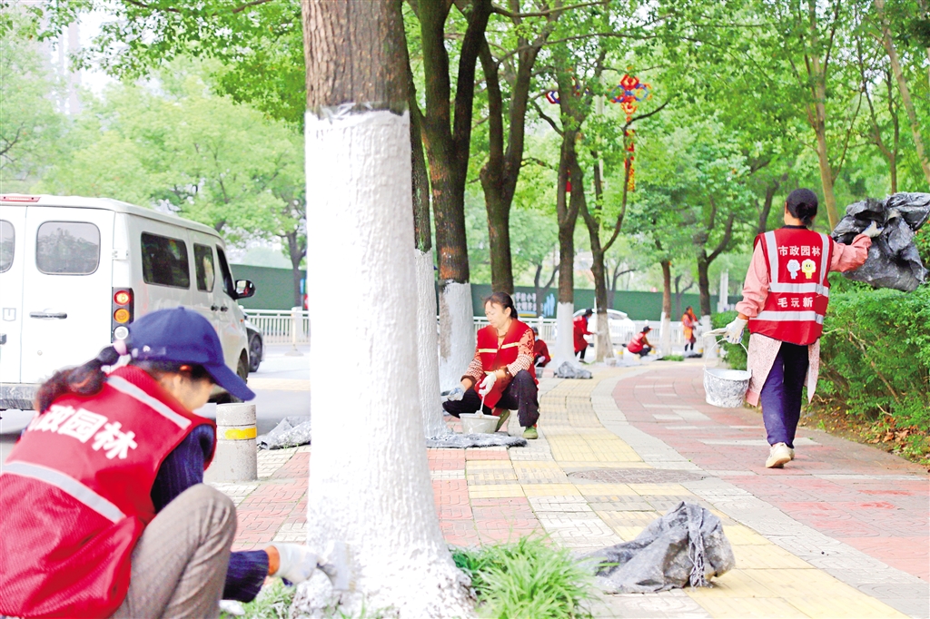 “刷白不是简单的涂涂画画,得兼顾效果与颜值。”现场管护负责人周宏安介绍,作业中严格执行统一标准,采用涂白剂、石硫合剂、水按20∶1∶10配比的药剂,在每棵树上标定基准线,确保涂白高度控制在1米至1.2米之间,做到上口平齐、下不露“脚”。针对树皮缝隙、孔洞等关键部位,工人们反复涂刷,同时全程做好防护,避免药剂外溅污染路面与树穴,实现“防护到位、环境整洁”双重目标。