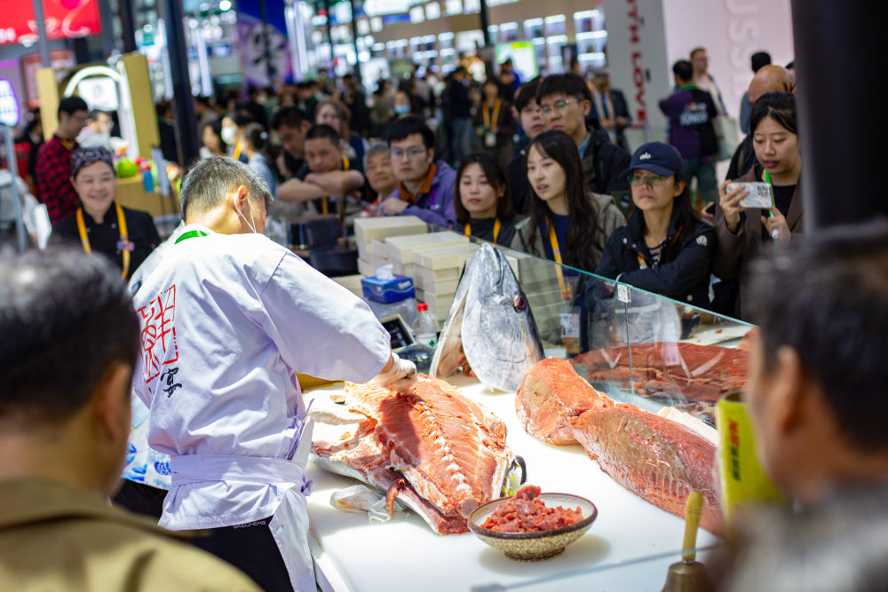2025年11月7日,在第八届进博会农食产品展区,参观者在一处展台观看开鱼秀。工作人员当场分切一条超过100公斤的金枪鱼。英国奶酪、法国葡萄酒、意大利黑醋、马来西亚榴莲、厄瓜多尔巧克力、新西兰乳制品、阿根廷牛肉……在本届进博会农食产品展区,多款“洋特产”亮相,展商现场加工、制作食品,供参观者品尝。
