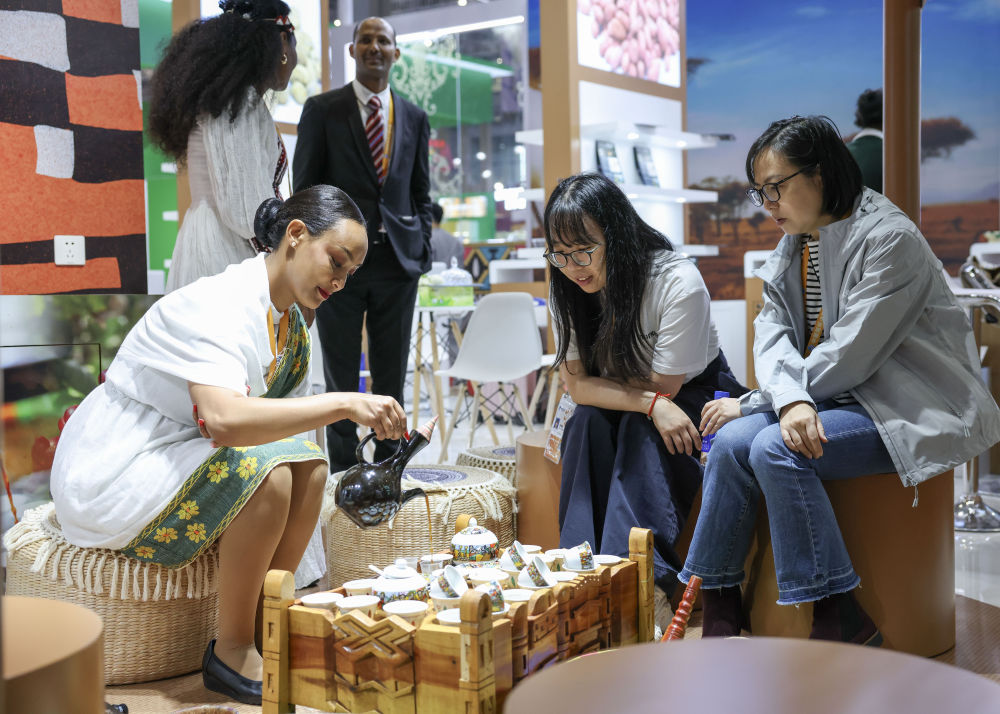 2025年11月7日,人们在第八届进博会国家展埃塞俄比亚馆品尝咖啡。本届进博会上,共有来自123个共建“一带一路”国家的企业参展,同比增长23.1%;来自最不发达国家的企业达163家,同比增长23.5%。自首届起,进博会便为最不发达国家提供免费标准展位。本届进博会首次为最不发达国家产品打造专区,扩容非洲产品专区,支持非洲建交国用足用好100%税目产品零关税政策,非洲企业参展数量同比增长80%。