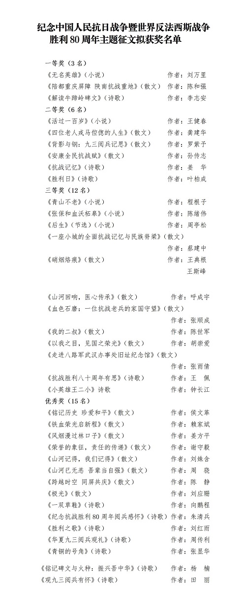 纪念中国人民抗日战争暨世界反法西斯战争胜利80周年主题征文评审结果公示