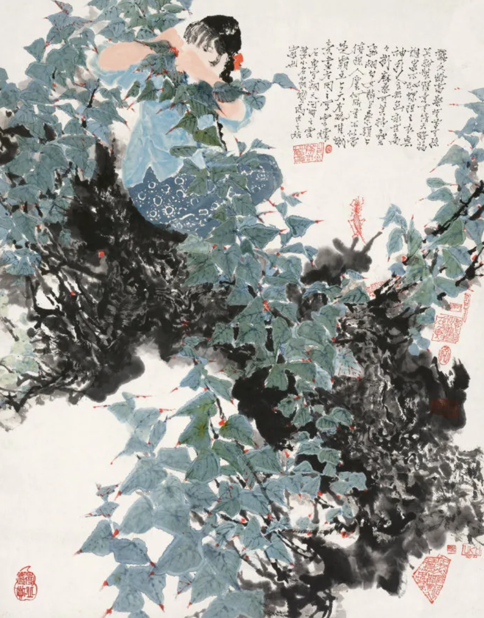 题识:蚕女龄乔桑,昔有王孙笑粉妆。罗素有情天降福,谁家不秘王祖。衣无神采食无鱼,永世商裔挂麻桑。可笑棉虫无飞翅,白女敢上桑颠上。俯视人寰何所有,不似当(年)楚霸王。上天有路唯蛾素,画者因之写云。石鲁写朝天河畔之云婆,小名安蛾,为女之姑家也。《采桑图》,2010春拍成交价1064万元。