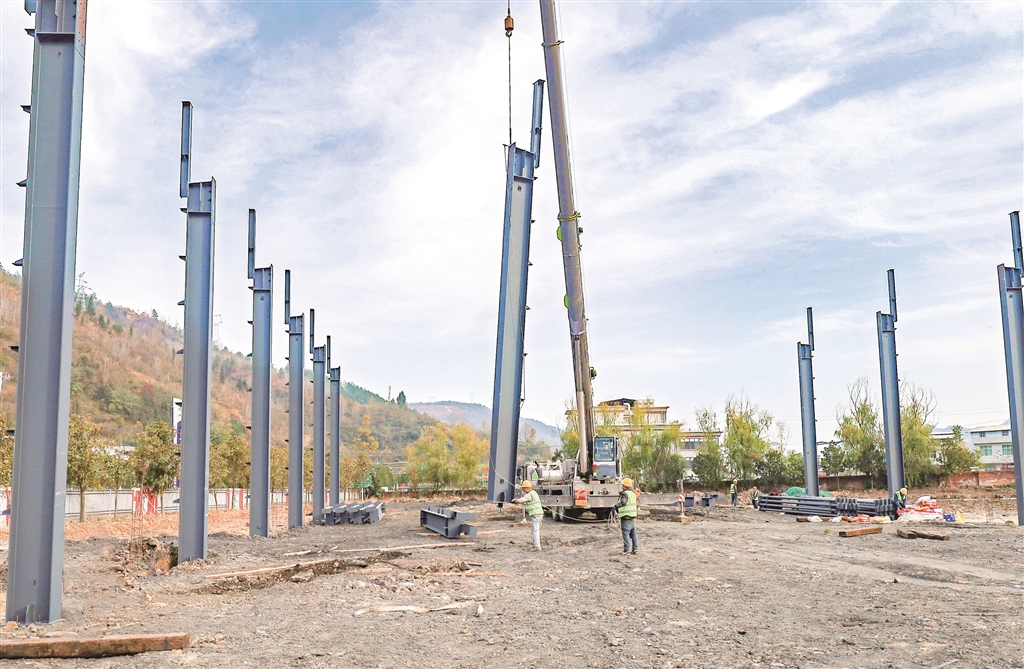 11月26日,紫阳高新区冷链仓储物流园项目第一批钢构材料进场,工人们正在开展吊装作业。 肖昌尉 摄