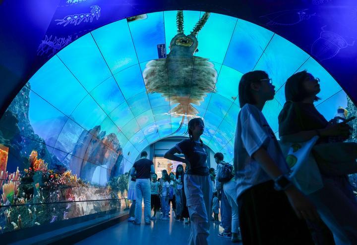 025年7月15日,游客在玉溪市澄江化石地世界自然遗产博物馆“寒武纪海底隧道”参观。