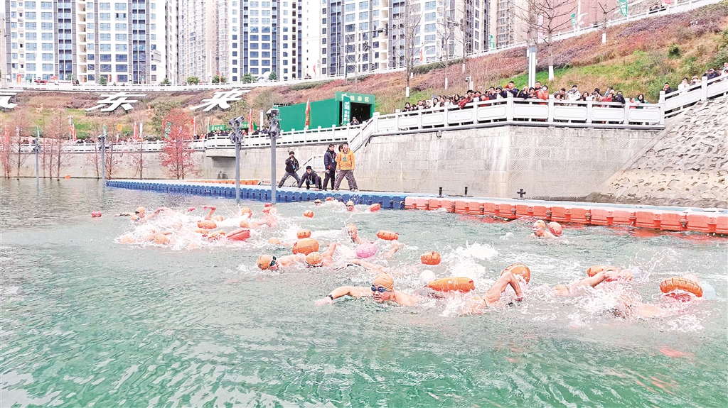 12月21日,陕西省第八届汉江公开水域冬泳赛在紫阳县月畔湾广场水域举行。当天,来自陕西、湖北、四川、重庆、河南、内蒙古自治区的44支代表队400余名运动员报名参赛。(储茂银 摄)