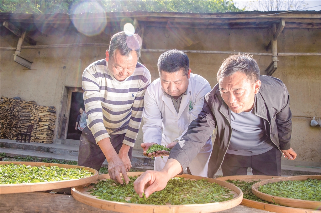 “十四五”期间,我市持续推进茶产业发展,努力实现茶产业“四时有收”。图为紫阳白茶非遗制作技艺代表性传承人在高桥镇裴坝村,向茶农推广紫阳白茶非遗制作技艺。