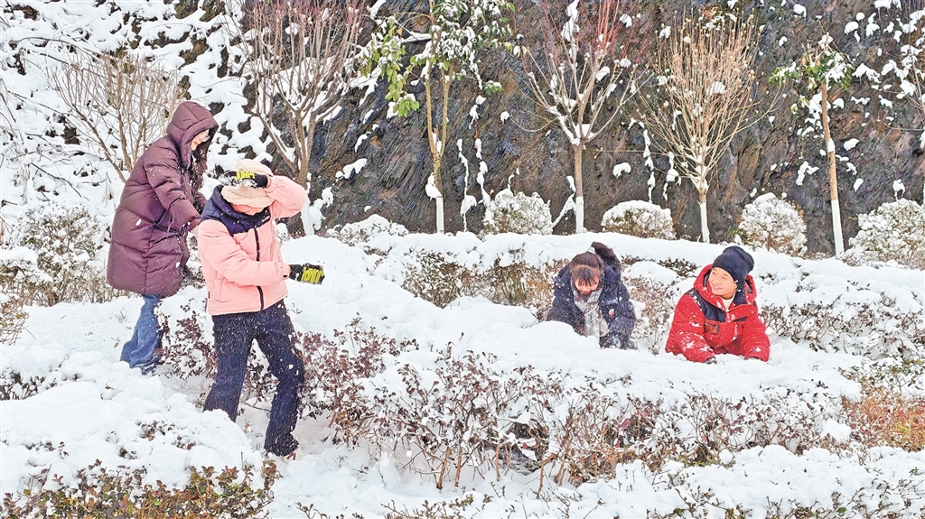 元旦期间,游客来到紫阳县米溪梁山顶,堆雪人,打雪仗,亲近大自然,享受假日的愉悦。 储茂银 摄
