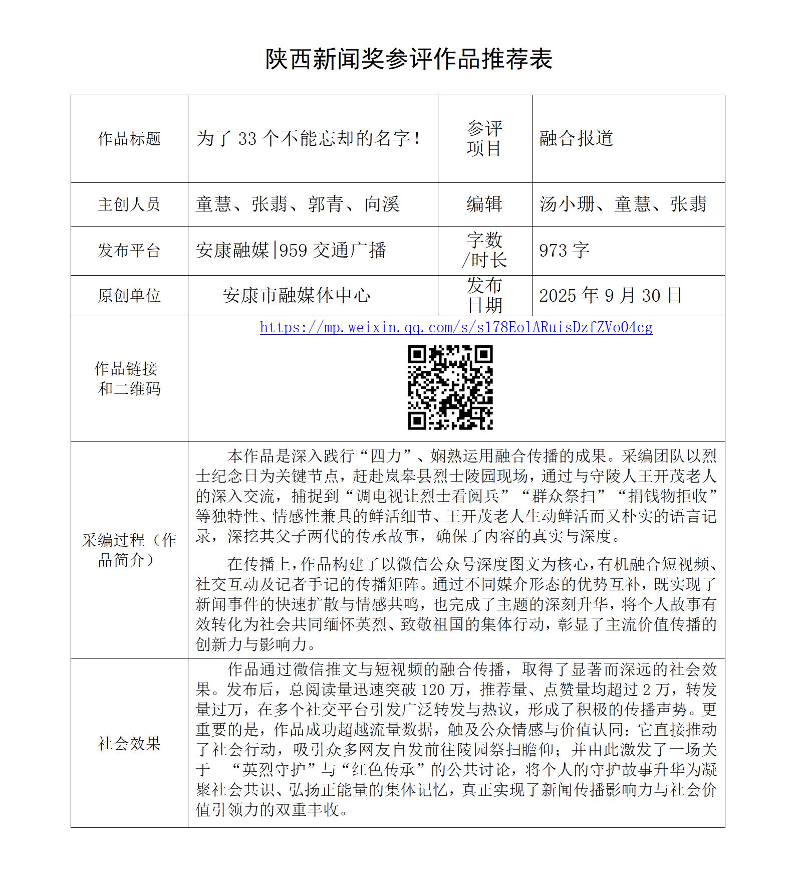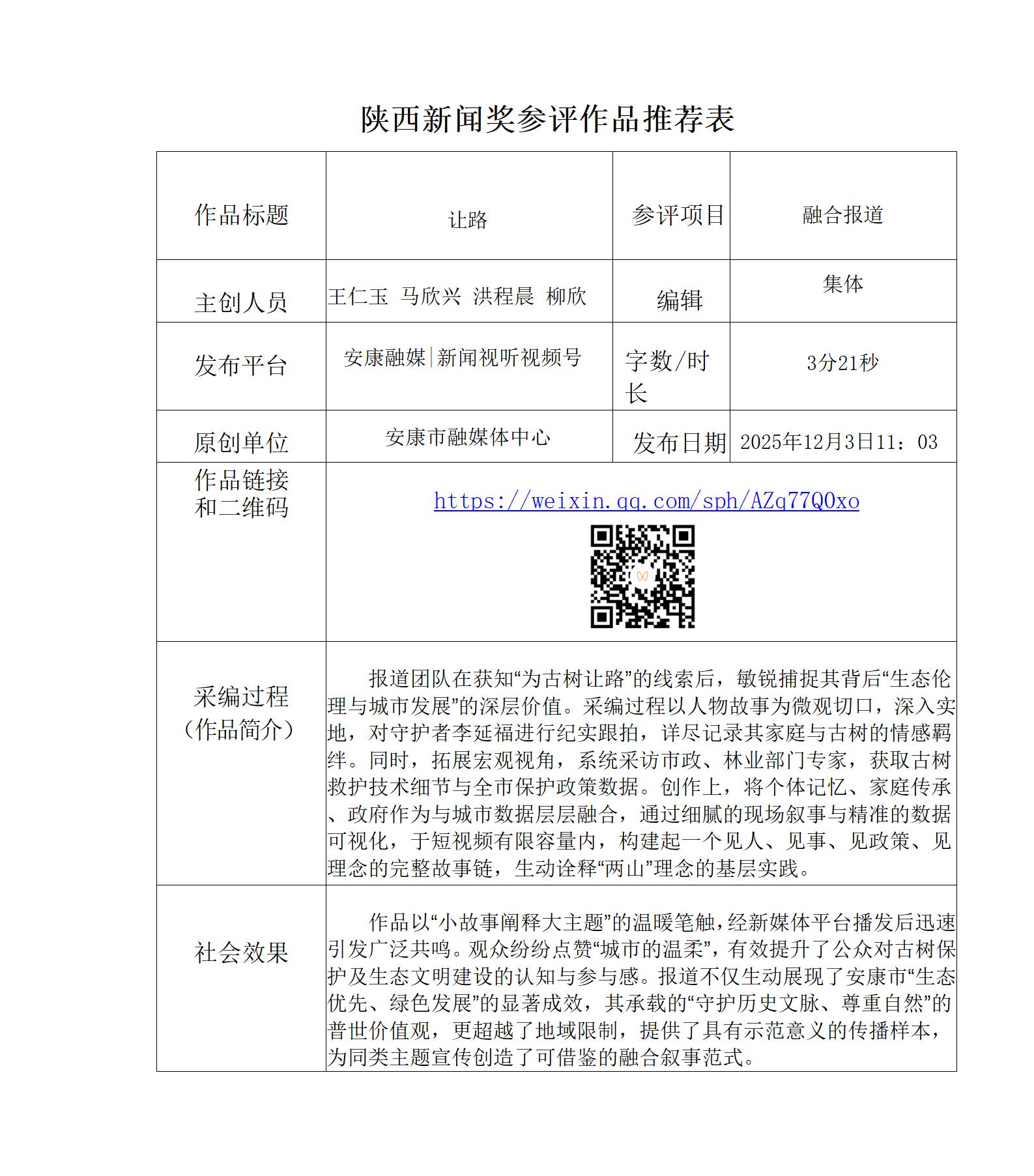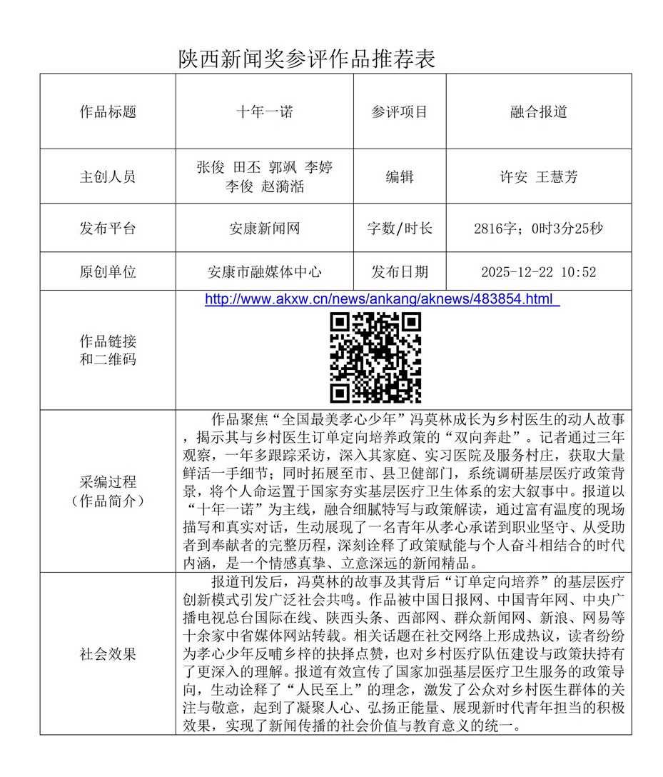 根据《陕西新闻奖、陕西省优秀新闻工作者评选办法》和《关于开展2025年度陕西新闻奖融合报道、应用创新和新媒体新闻专栏作品推优工作的通知》要求,经个人申报、部门推荐和中心编委会严格筛选,对以下3件2025年度陕西新闻奖融合报道、应用创新、新媒体新闻专栏参评作品进行公示。(作品推荐表附后)