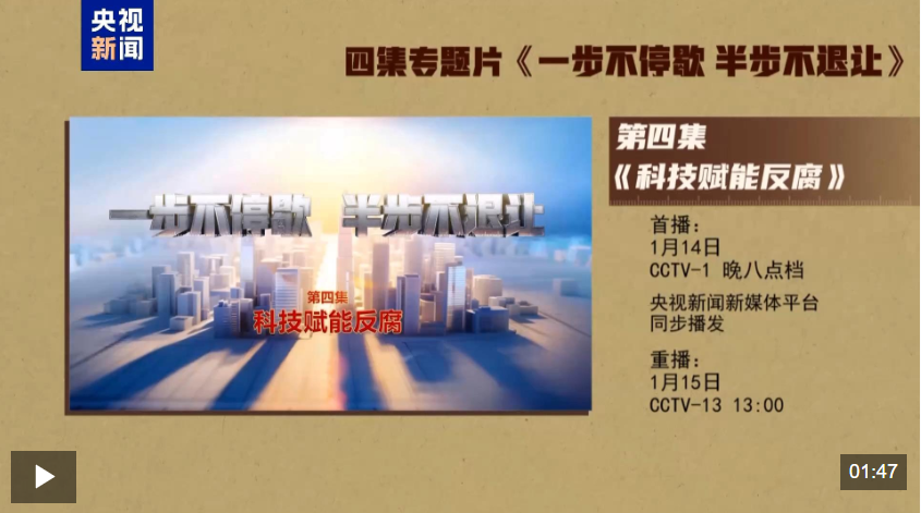电视专题片《一步不停歇 半步不退让》第四集《科技赋能反腐》,讲述纪检监察机关丰富防治新型腐败和隐性腐败有效办法,以信息化赋能正风反腐,充分运用科技手段精准发现不正之风和腐败问题线索、迅速有效突破案件,着力提升智慧反腐、科技反腐水平。总台央视综合频道1月14日晚8点档播出,央视新闻新媒体平台同步播发。