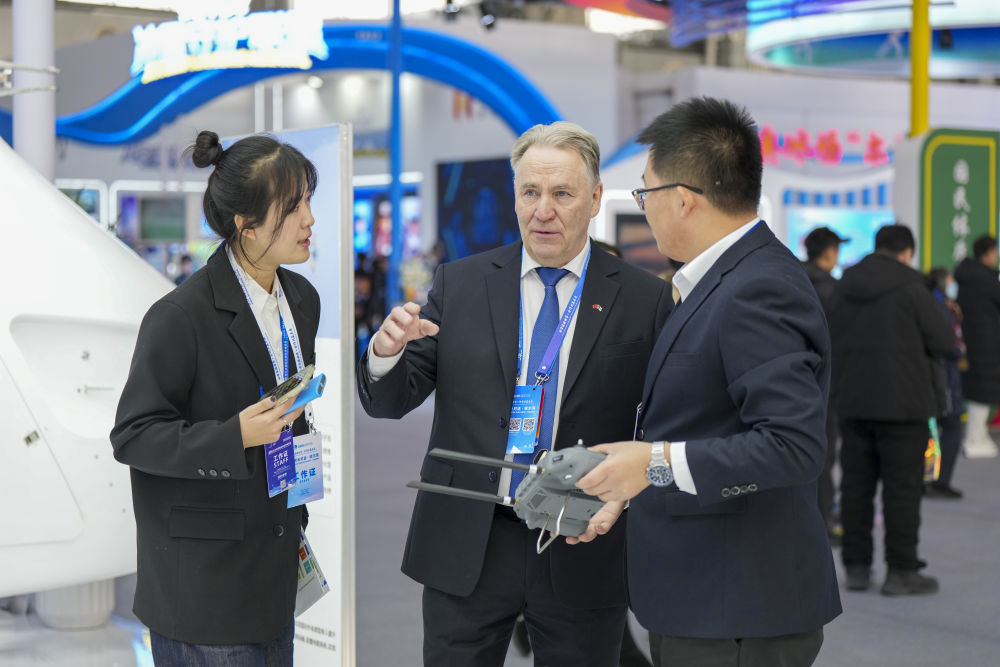 1月6日,在2026哈尔滨国际冰雪经济博览会现场,参会嘉宾(中)在了解一款工业无人机的参数和性能。新华社记者 王松 摄
