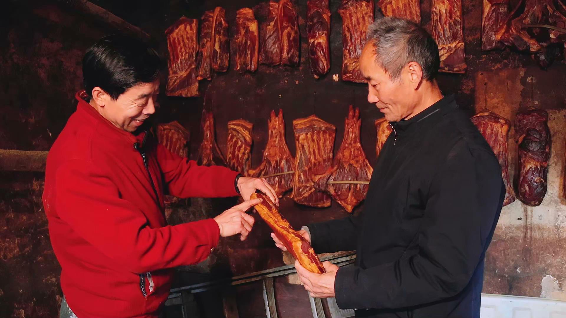 石泉县城关镇珍珠河村村民王全勇(左)熏制腊肉已有十来年,是当地有名的腊味制作能手。今年,他熏制的上万斤腊肉和香肠早早就被预订,有的还通过网络被卖到北京、山东等省市。 郭依萍 摄