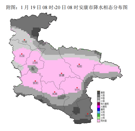 根据最新气象观测资料和数值模式分析,经省市会商研判,预计今天夜间至21日我市有雨雪寒潮天气,强雨雪时段为19日白天,巴山沿线部分地方有冻雨,川道河谷地区以小雨或雨夹雪为主,中高山地区雨夹雪转小到中雪,秦巴山区及东部高山局地大到暴雪,20及21日白天全市大部仍有间歇性弱雨雪天气。过程累计降水量:全市大部5~8毫米,东部局地超过12毫米,高山地区新增积雪深度可达3~12厘米。今天夜间至22日气温持续走低,过程全市大部平均气温下降8~10℃。22日雨雪天气结束,受前期雨雪天气和冷空气持续影响,气温仍较低,预计最低气温将出现在22日或23日清晨,川道地区-5~-2℃,中高山地区-10~-6℃,局地低于-12℃。过程期间全市大部平均风力3~4级,山区局地有6级或以上阵风。