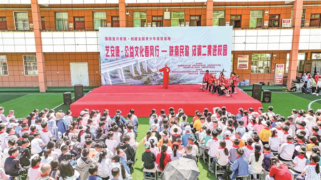 线上课程补足了师资缺口,线下的实践体验与成果展示则进一步巩固了美育成效。该馆全年开展版画、民歌、剪纸等专项培训48场,服务青少年8000余人次;举办“儿童版画走基层”展览12场,培训学生1200余人,24件学生作品入选全国少儿版画双年展;开展“非遗进校园”陕南民歌、汉调二黄等展演培训30余场,成立非遗社团10个,发展学员400余人。在汉调二黄进校园活动中,安康中学教育集团初中部的学生们身着传统戏服,演绎《太君辞朝》选段,一招一式有板有眼,韵味十足。“为了排好这个节目,同学们利用课余时间刻苦训练了3个月。”指导老师许世莲说,通过学习戏曲,学生们不仅提升了艺术素养,更领悟到了其中蕴含的家国情怀和民族精神。