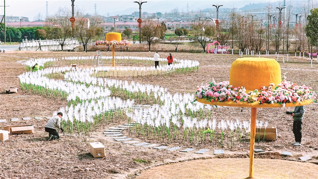 不远处的迎宾公园里,另一组工作人员正沿着步道和绿化带安装布置芦苇灯带。一根根芦苇状的灯杆错落竖立,待夜幕降临时,将勾勒出公园蜿蜒的轮廓,营造出宁静温馨的夜间景致。