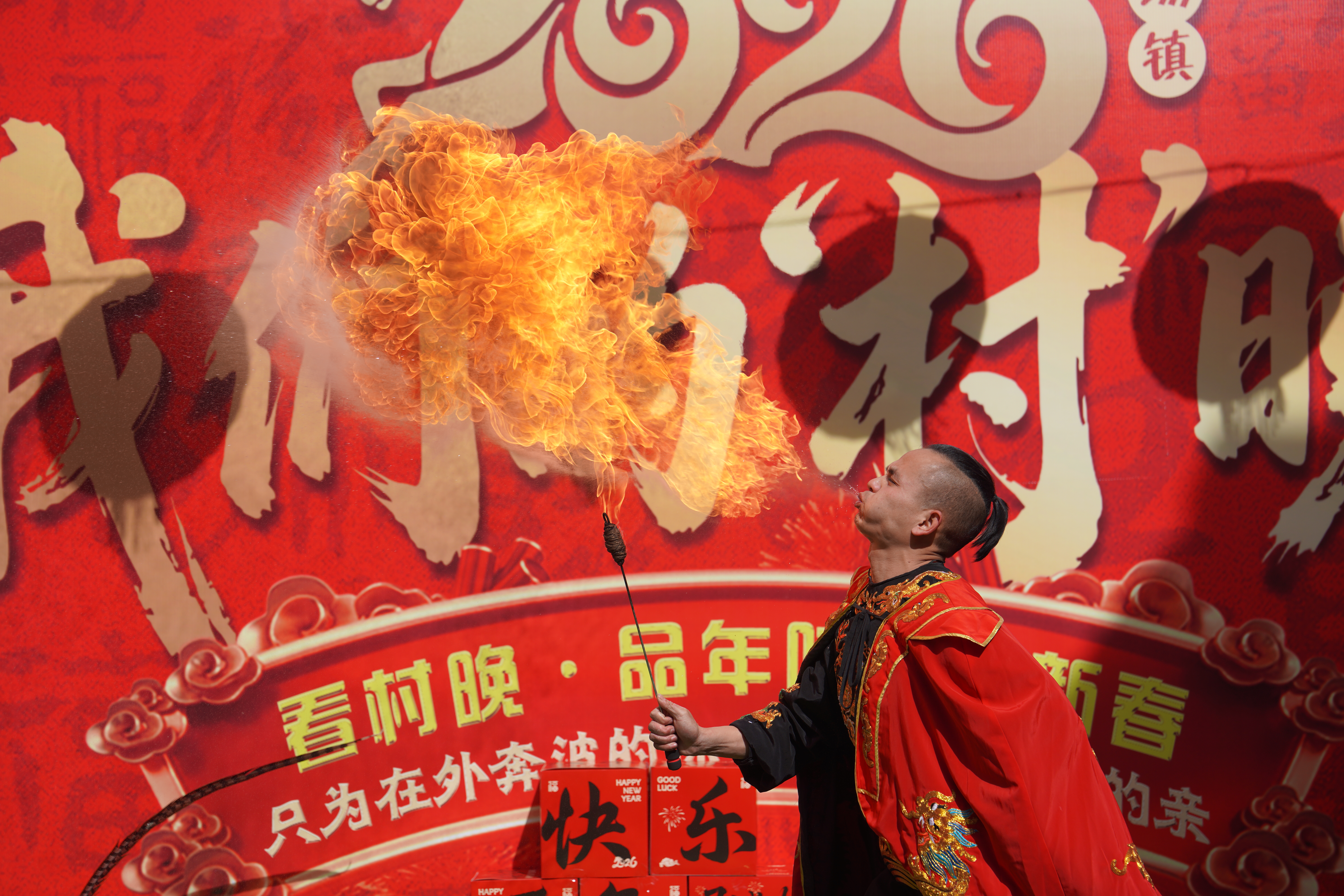 △ 2月2日,演职人员在新场镇“村晚”舞台上进行特技表演。