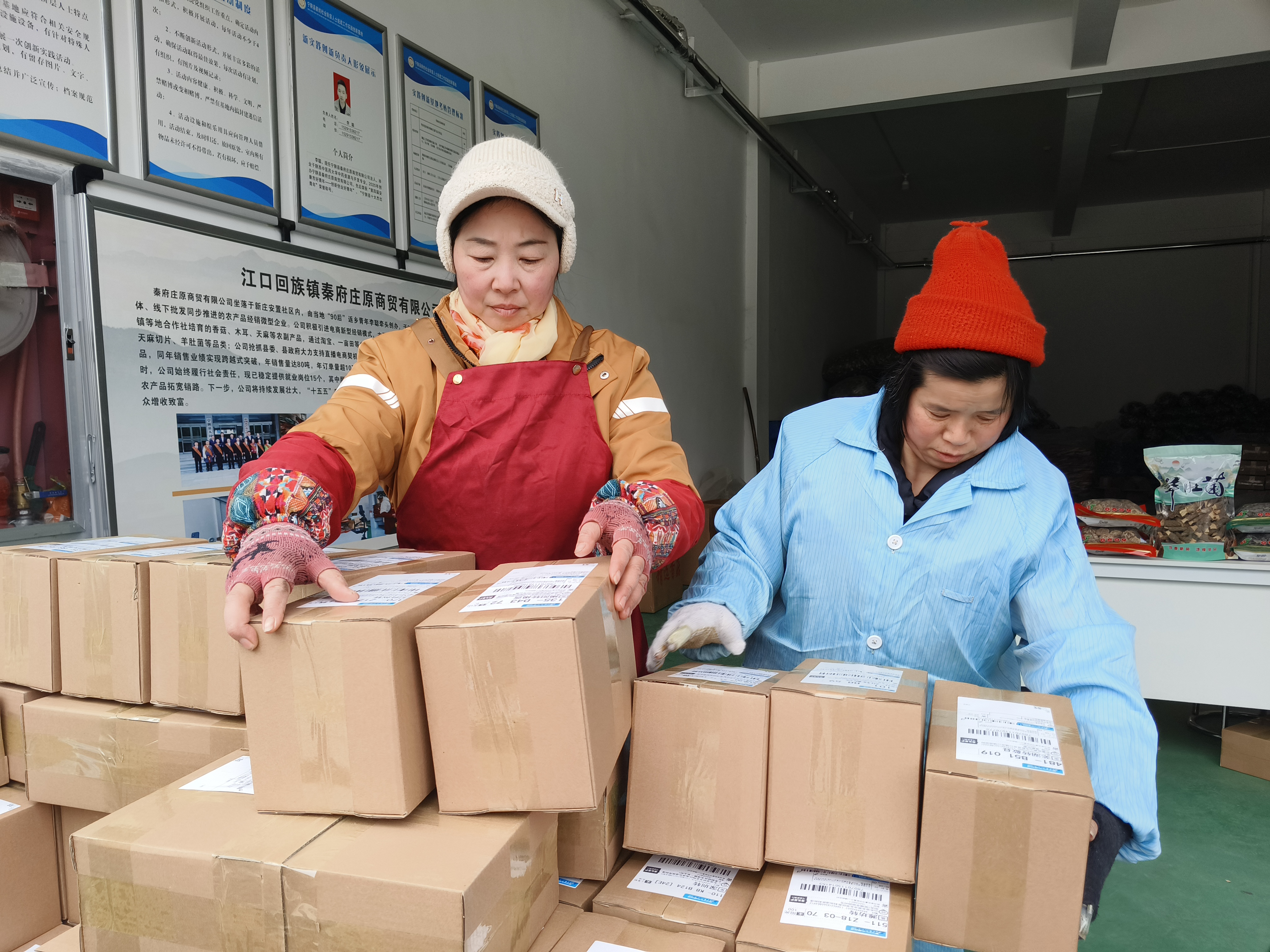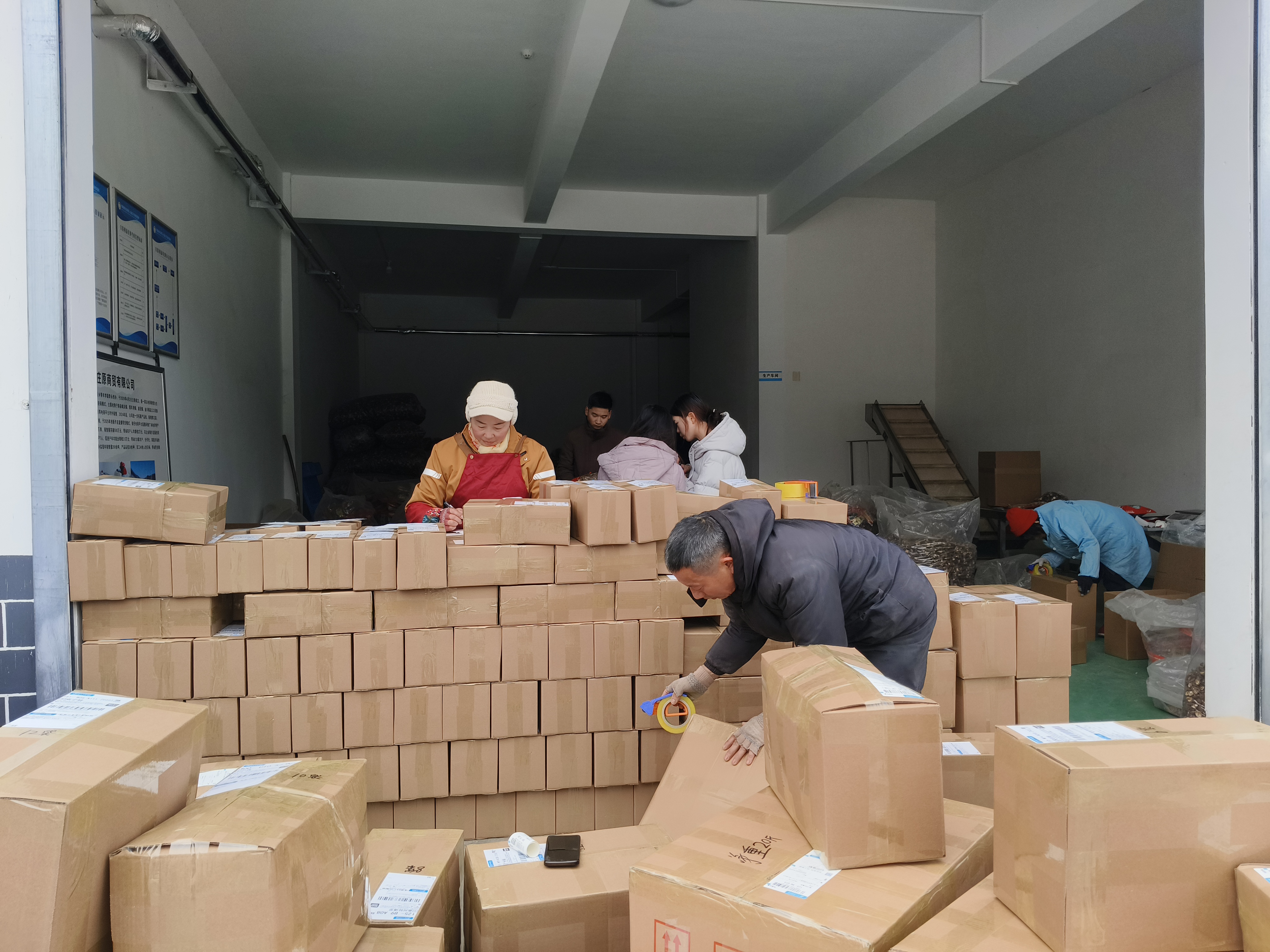 春节前夕,宁陕县江口回族镇秦府庄原商贸有限公司内一片繁忙,工人们忙着打包、发货。近期,宁陕山珍线上销量持续走高,日均发货约700单。(刘长兵 摄)