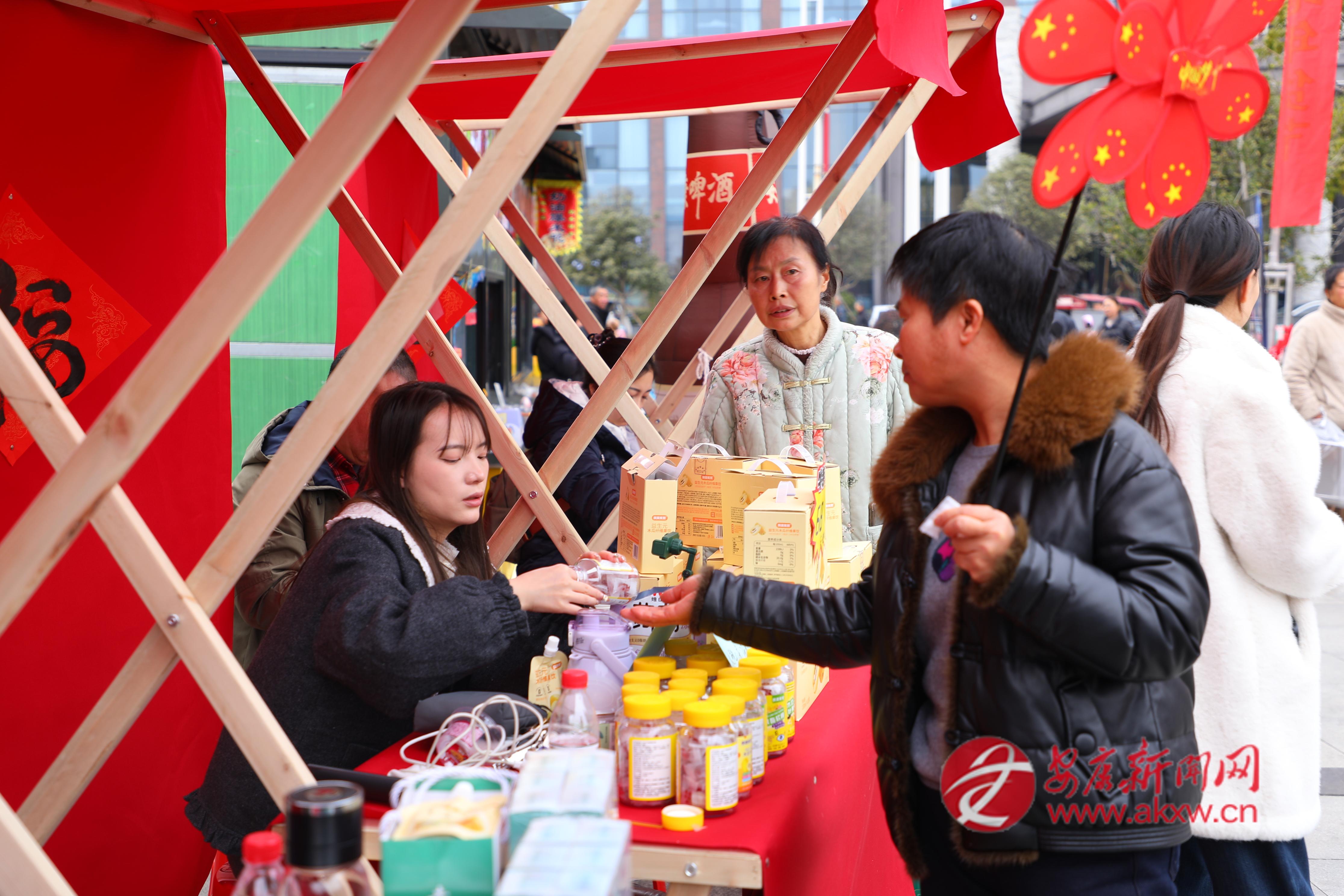 舞台之上好戏连台,集市之中更是热火朝天。年货展销区内摊位林立、人潮涌动,20余家企业带来的安康富硒茶、红薯粉条、木瓜饮、土蜂蜜、黄连牙膏等安康特色产品琳琅满目,让人目不暇接。“听了摊主讲解茶山生态和制茶工艺,感觉买得特别踏实,带回去自己喝或当作新年伴手礼都合适,能实实在在支持本地茶农,这年货买得暖心又有意义。”市民廖先生提着刚购入的茶叶笑着说。