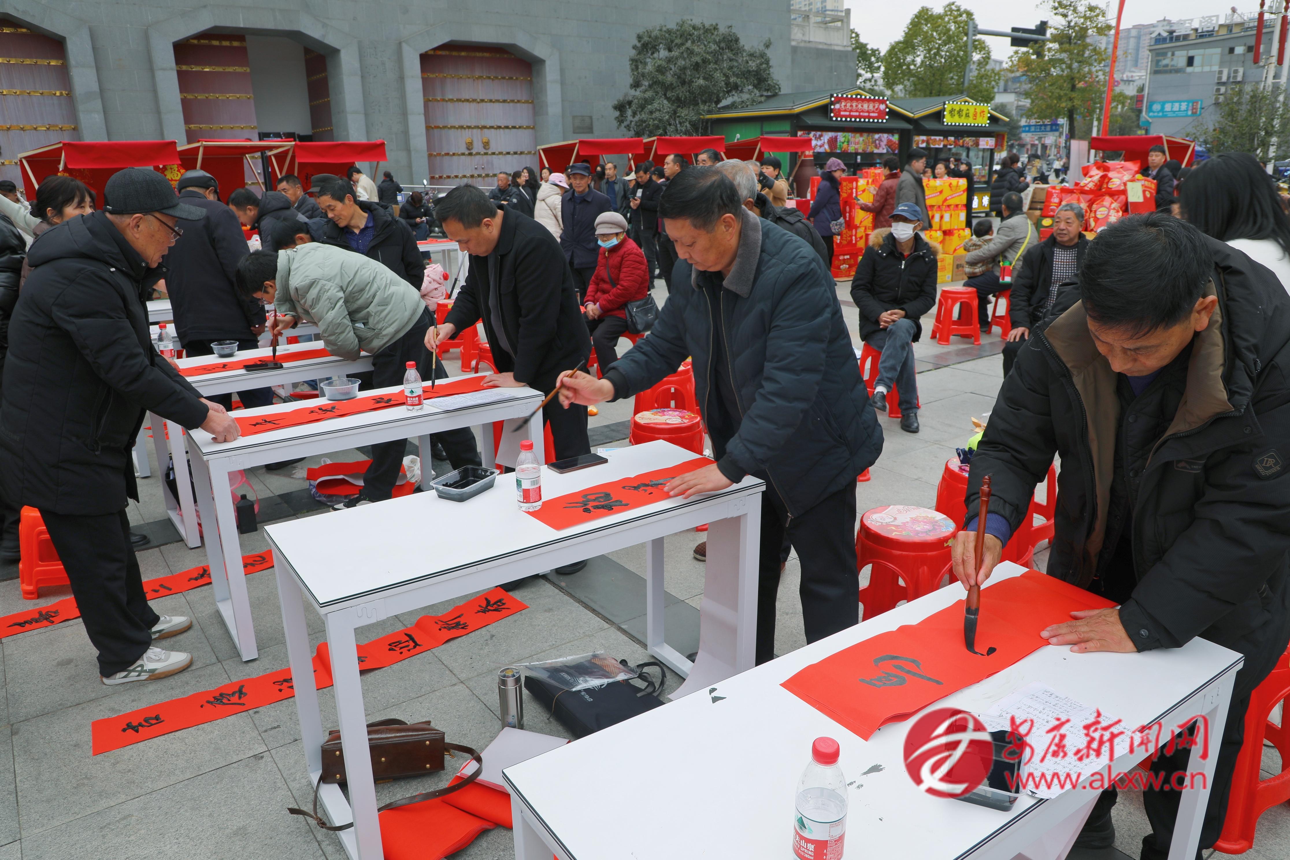 活动开场,铿锵的舞狮表演点燃全场热情,汉调二黄尽显秦巴韵味,嘹亮的歌唱与精妙的川剧变脸轮番上演,独具特色的文艺演出赢得市民群众阵阵掌声,其间的抽奖活动与趣味娱乐环节,吸引市民沉浸式参与其中,更是将节日的欢乐氛围推向高潮。另一边,市文化产业协会的书法家们挥毫泼墨,一副副喜庆的大红春联、一张张吉祥的福字带着墨香送到群众手中。