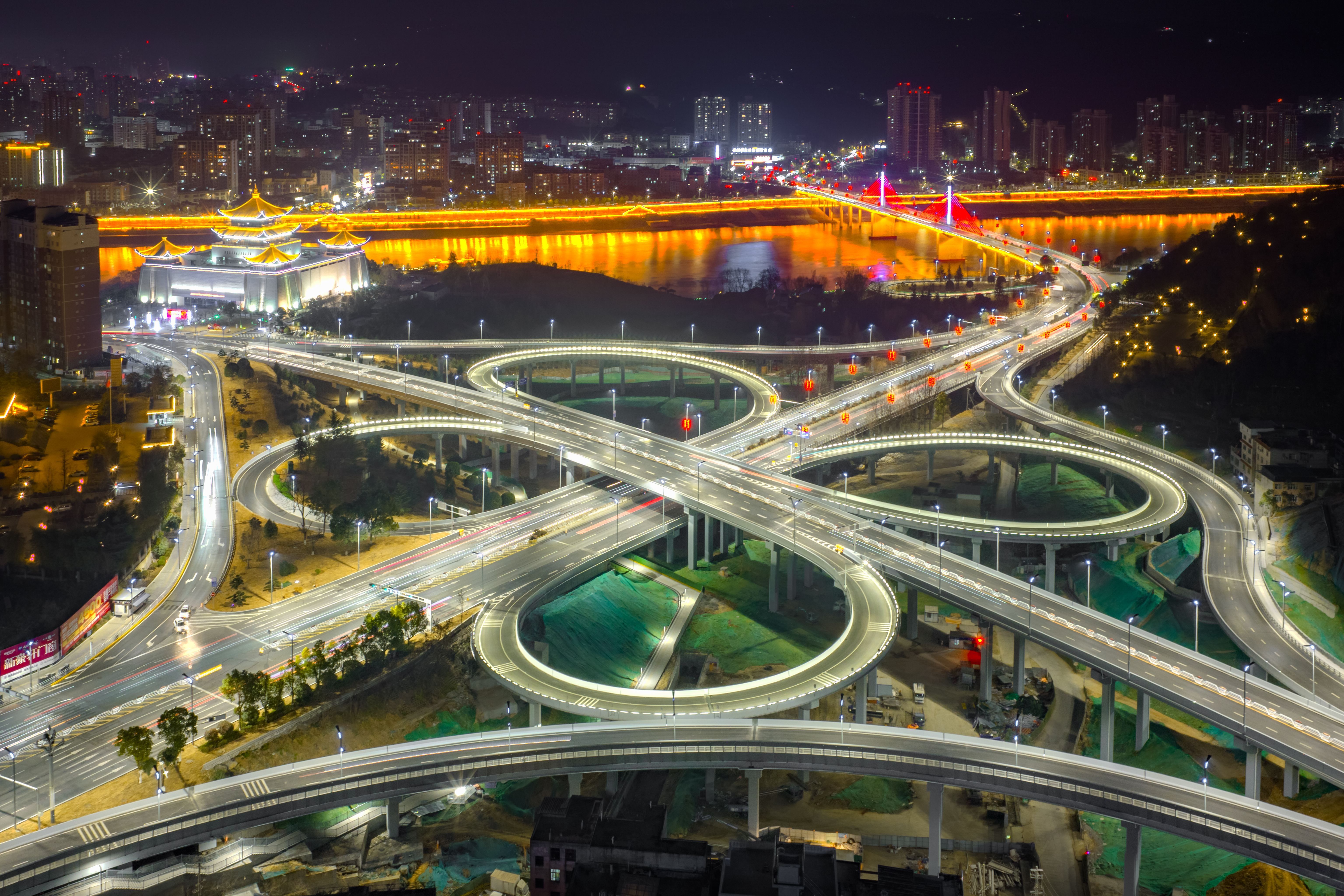 夜晚的七里沟立交,流光溢彩,匝道如银链交织,与汉江粼粼波光彼此辉映,共同勾勒出一幅流动的城市发展画卷。唐军 摄