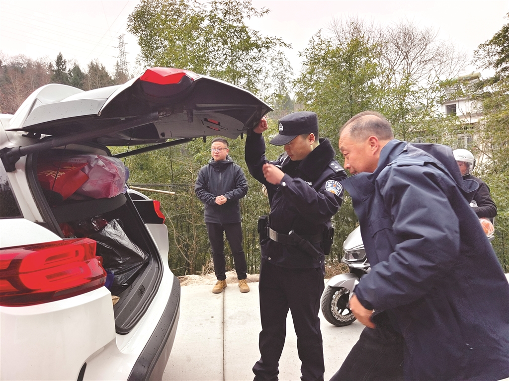 石泉县公安局在城关镇三里沟北辰森林公园设卡检查,筑牢森林防火“安全墙”,守路口、护平安、倡新风。杨勇 摄
