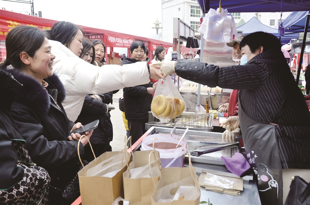 节日里的紫阳县城一派繁荣祥和,图为市民在颇有名气的焕古高老二的油糍摊前排队购买。彭召伍 摄
