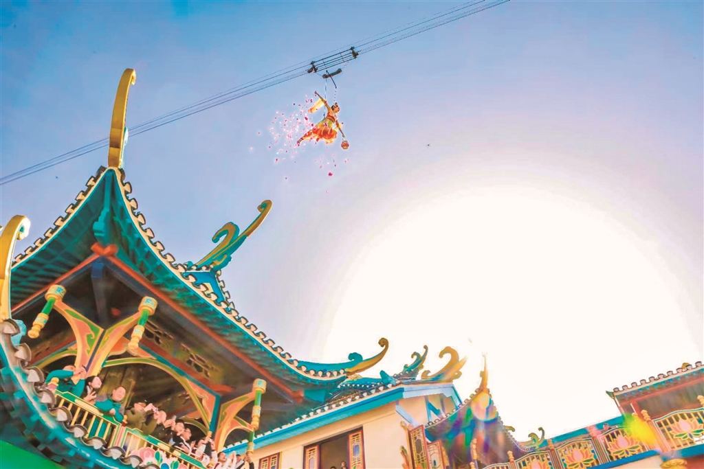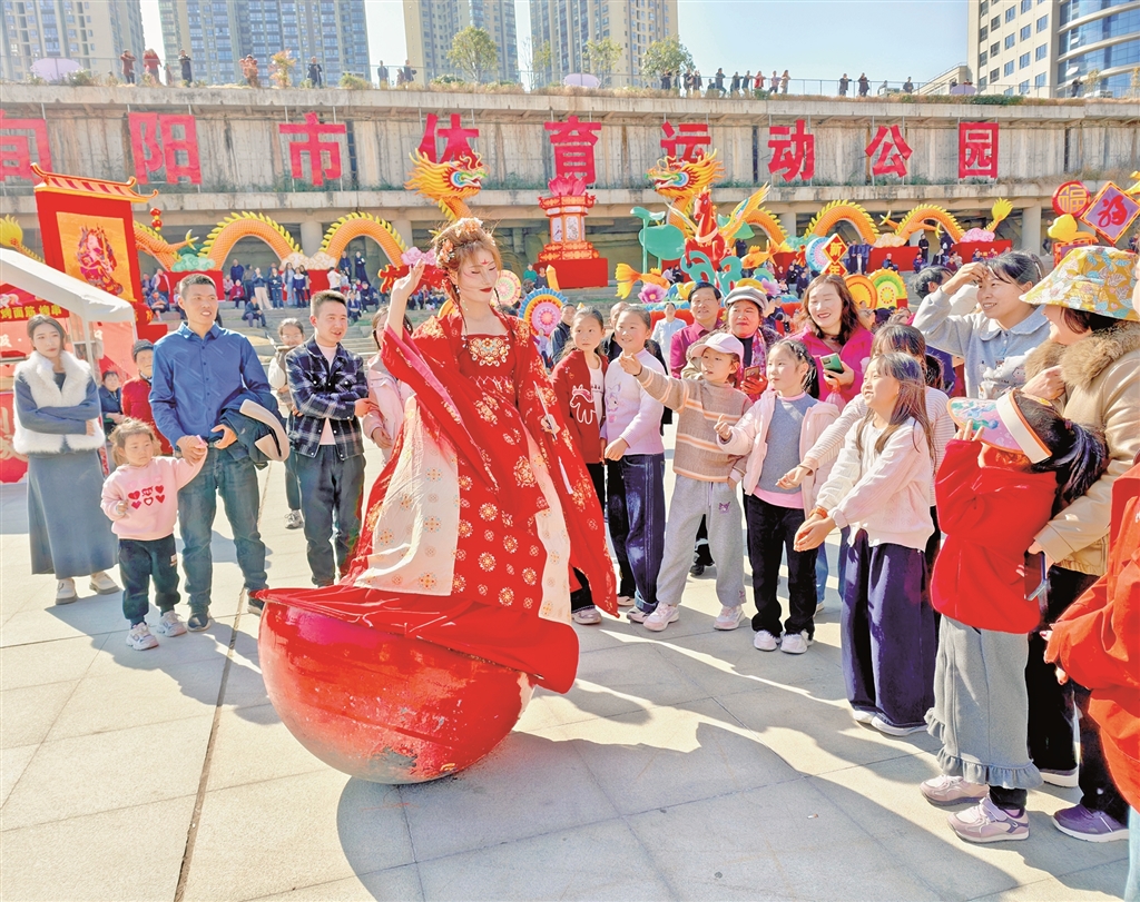 春节期间,瀛湖汉水街文旅影视基地热闹非凡。图为游客们欣赏基地精心准备的表演。张忠 摄